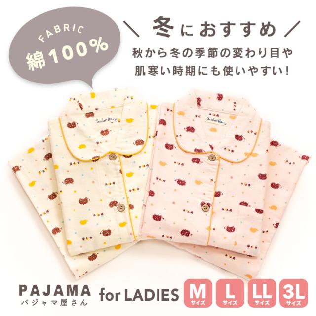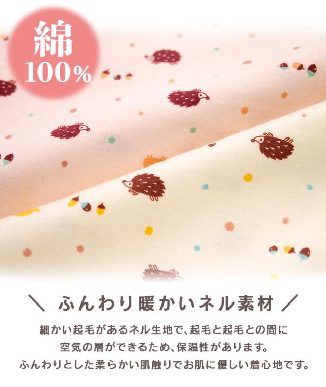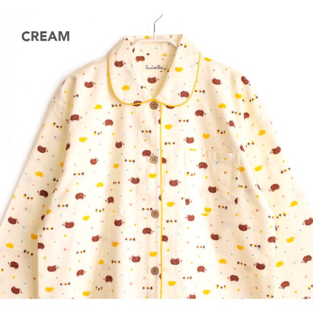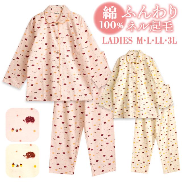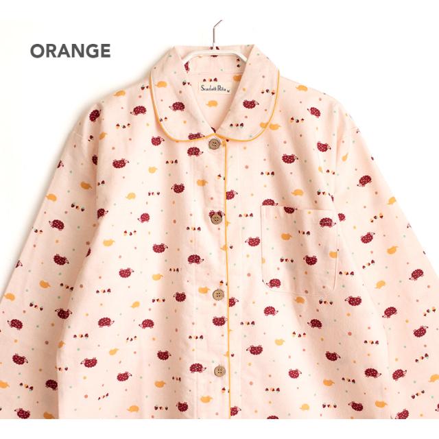 パジャマ レディース 綿100% 長袖 冬 前開き ボタン ネル起毛 前開き ボタン ハリネズミ柄 オレンジ クリーム M L LL 3L かわいい おそろい