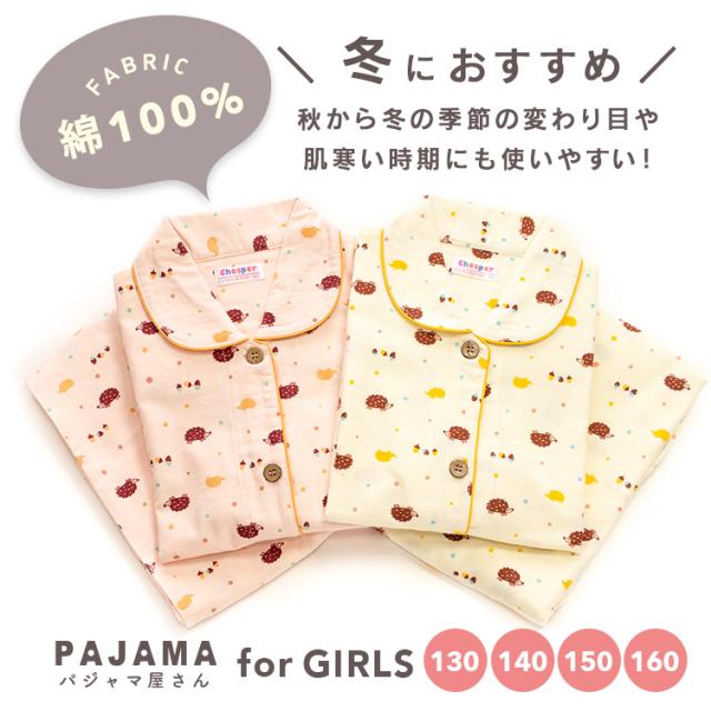 パジャマ キッズ 女の子 綿100% 長袖 冬 前開き ボタン ネル起毛 ハリネズミ柄 オレンジ クリーム 130 140 150 160 子供 キッズ ジュニア ガールズ かわいい おそろい