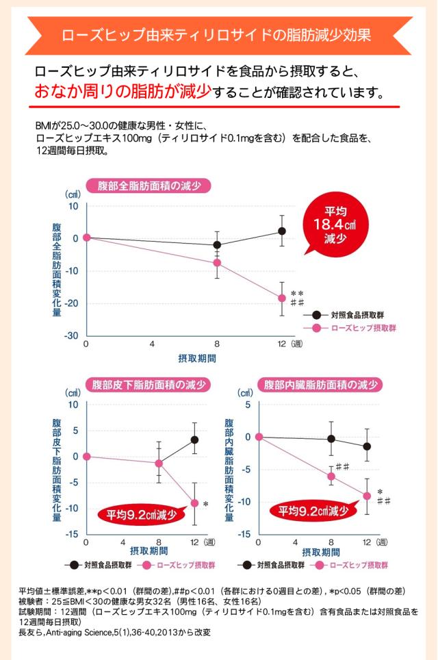 ローズヒップ由来ティリロサイドにはBMIが高めの方の体脂肪を減らす機能があることが報告されています。