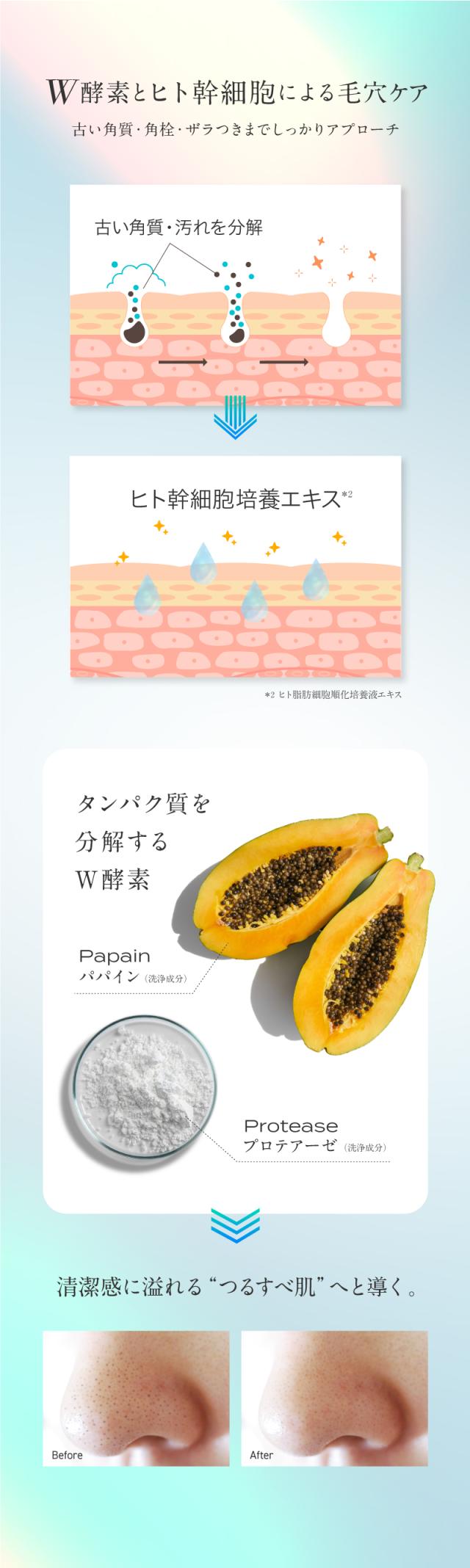 たんぱく汚れをしっかり落とす2種類のタンパク質分解酵素*と、もっちり濃密泡が毛穴汚れ・黒ずみ・角栓・ザラつきを取り、清潔感あふれる つるすべ肌へ