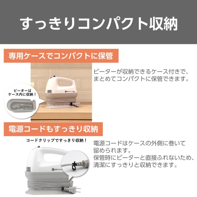 ABC Cooking Studio共同開発で生まれた新ビーターでスピーディーに泡立て!![]() ■ビーター形状を見直し、泡立て効率がUP!※1 少量でも使いやすく、スピーディーに泡立てができます。 また、ビーターの中心に棒がなくワイヤー形状で洗いやすいです。素材もステンレスで食洗機にも対応しています。 ※1:当社従来機種THM272との比較 ■調理中に材料の追加などをする時、ビーターを付けたまま立てて置けます。 ■ビーターが収納できるケース付きで、まとめてコンパクトに保管できます。 ■電源コードはケースの外側に巻いて留められます。 保管時にビーターと直接ふれないため、清潔にすっきりと収納できます。 ■高速で素早く泡立て、仕上げは低速でキメ細かに。 混ぜ具合や材料に合わせて、ビーターの回転スピードを5段階に調節できます。 ■使用後も手を汚すことなく、ワンタッチでビーターを取り外せます。 *電源コードをコンセントから抜いた状態で実施ください。 ![]() ■サイズ:高さ / 175mm 幅 / 190mm 奥行き / 85mm(収納時) ■質量:830g(収納時:ビーター・ケース含む) ■消費電力:80W ■付属品:ビーター2本・収納ケース・コードクリップ ■定格時間(連続使用可能時間):10分 ■機能:速度調節5段階切替 ■カラー:ホワイト ■コード長:1.6m ■パーツ:コードクリップ(WL0030)、ビーター(1本 ワイヤータイプ)(500848)、収納ケース(500849) ■保証期間:1年 ■主材料:本体:ABS |