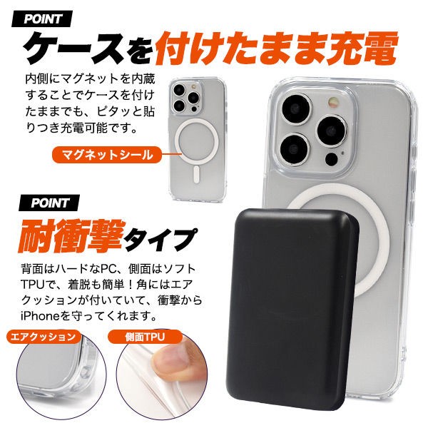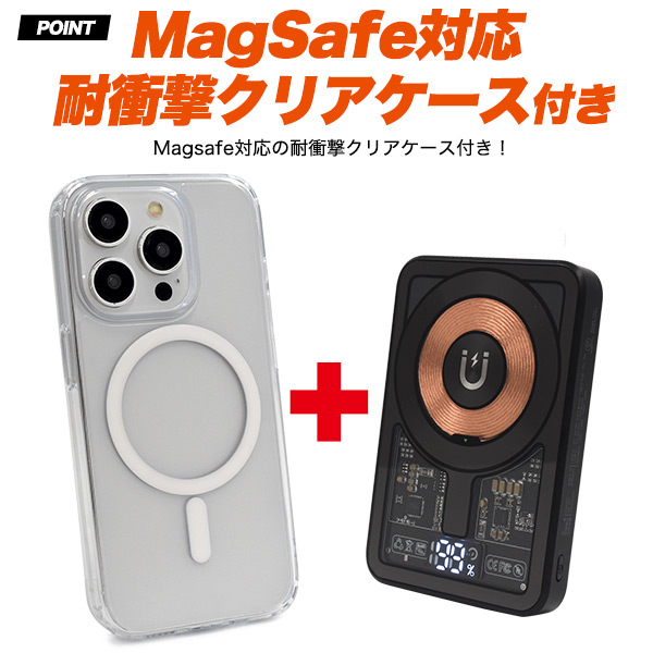 MagSafe対応 モバイルバッテリー & 専用クリアケースセット iPhone12〜iPhone15 急速充電 5000mAh マグネット付き ワイヤレス充電 2台同時充電可能(Type-C充電 / ワイヤレス充電)軽量 小型 PSE技術基準適合 チャージャー マグセーフ 送料無料