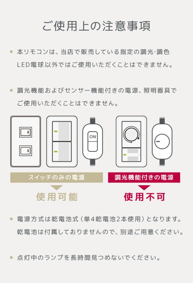 | 注意事項 | ・取付・取外しは必ず電源を切った状態で行なってください。 ・当電球は他社のリモコンでは機能しません。必ず当店販売の専用リモコンを別途購入してご使用ください。 ・調光機能およびセンサー機能付きの電源、照明器具でご使用いただくことはできません。 ・電源方式は乾電池式(単4乾電池2本使用)となります。乾電池は付属しておりませんので、別途ご用意ください。 ・点灯中のランプを長時間見つめないでください。 ・商品は、モニターによって色合いが異なって見える場合があります。 ・仕様・デザインは改良のため予告なく変更することがあります。 |