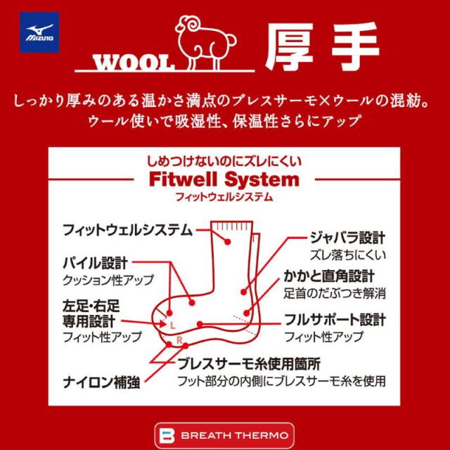| 特徴 | しっかり厚みのある温かさ満点のブレスサーモ×ウールの混紡。 ウール使いは『 go to by mizuno 』 ウォーキングにもおすすめ。 安定の履き心地の足底はクッション性の高いパイル設計。 フィットウェル(特許)だからずれ落ちにくい。 左足、右足専用設計 足首のだぶつき防止『 かかと直角設計 』 吸湿発熱機能 ミズノ独自の吸湿発熱素材『 ブレスサーモ 』は、 人体から発生する水分を吸収して発熱効果をもたらす 新たしい保温メカニズムを実現。 ブレスサーモの吸湿発熱した空気を繊維に間に取り込み保温する為、 衣服内をドライで温かな状態に。 乾燥機のご使用はお控えください。 ・左右専用設計(右足 R・左足 L) ・クッション性アップ足底パイル設計 ・しめつけないのにズレにくい『 フィットウェル 』設計(特許) ・生地のだぶつき軽減『 かかと直角 』設計 ・アーチ部フィット性向上『 フルサポート設計 』 ・アキレス腱部にずれ落ちにくい『 じゃばら設計 』 |