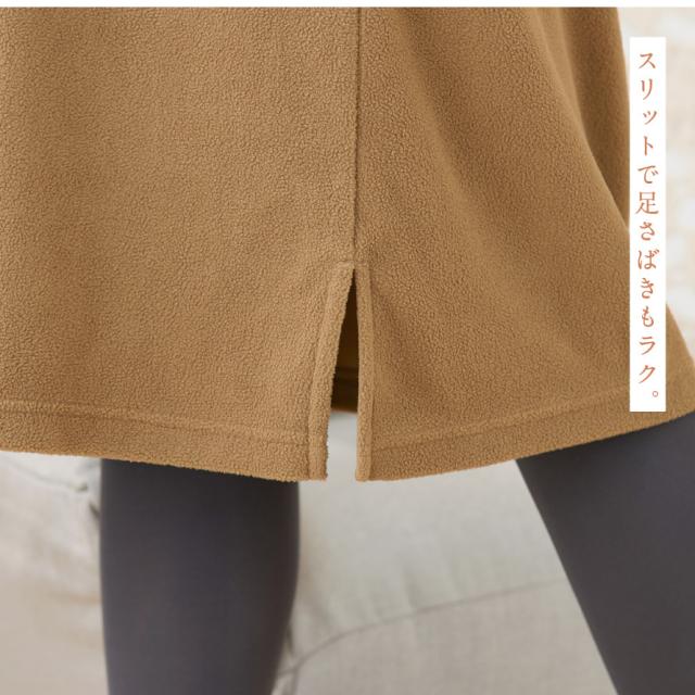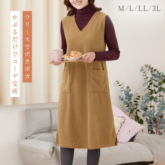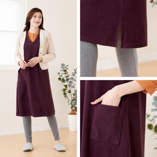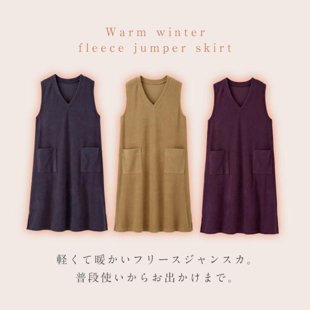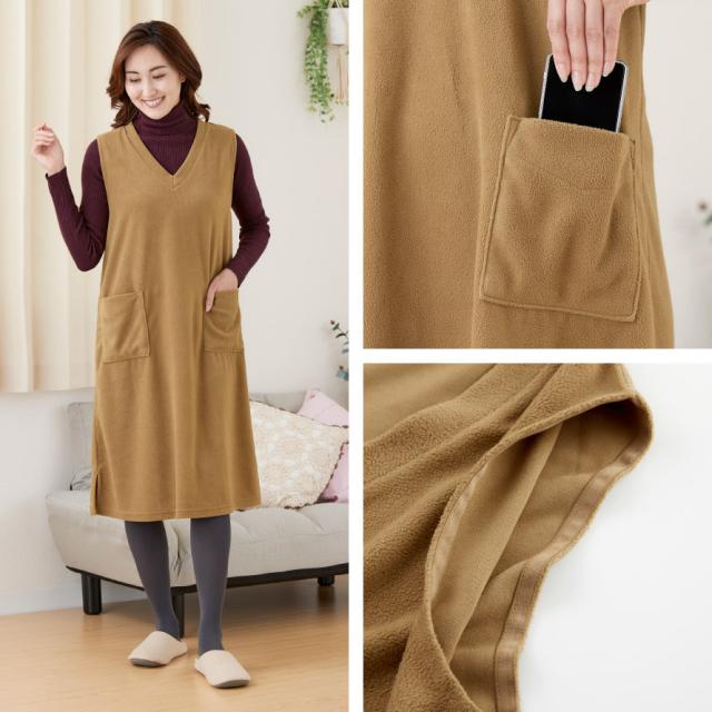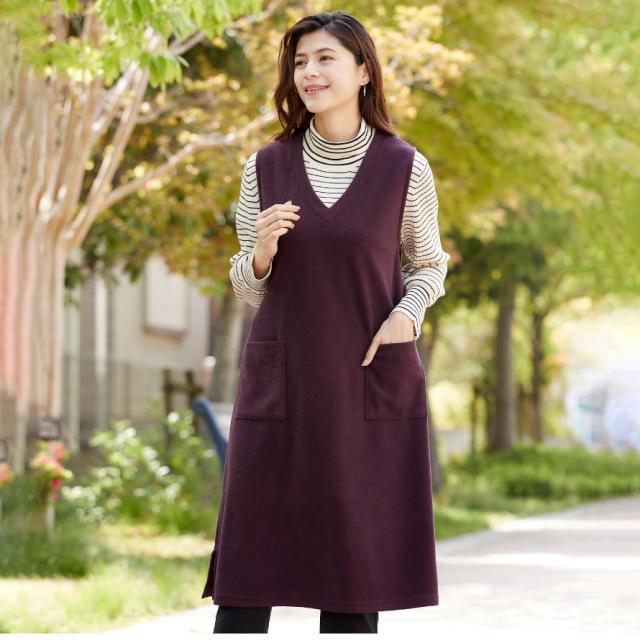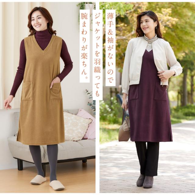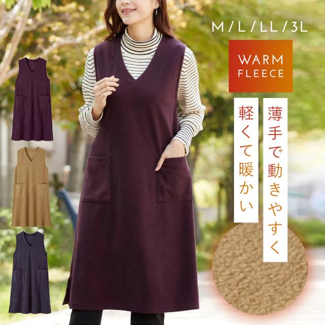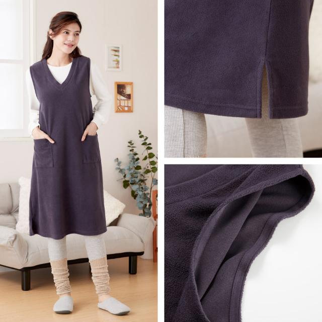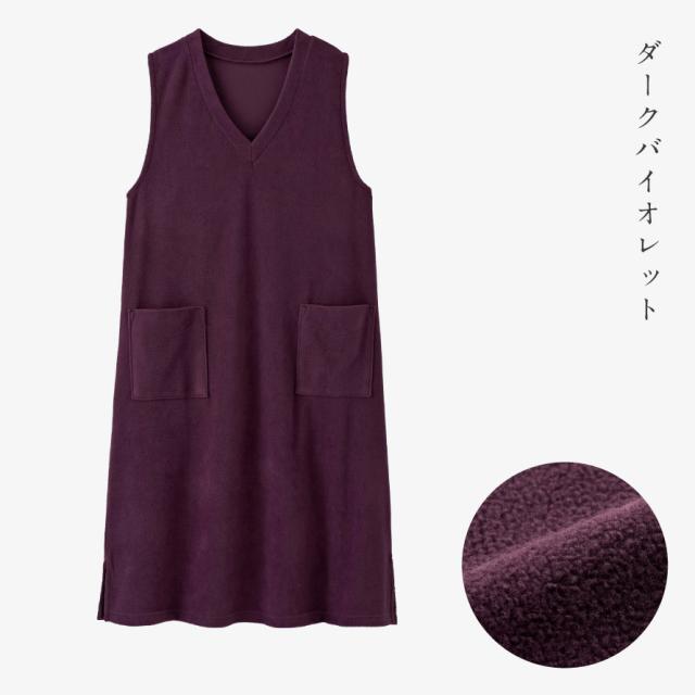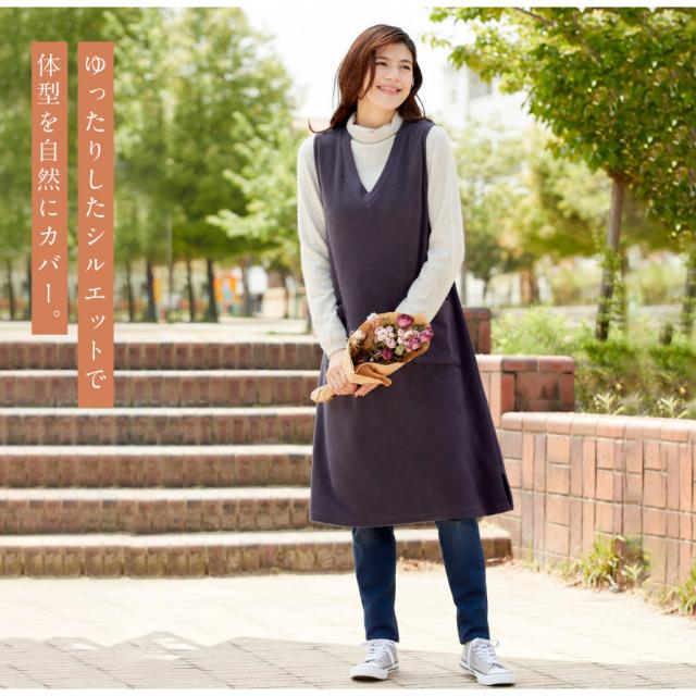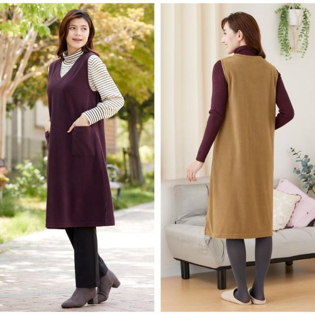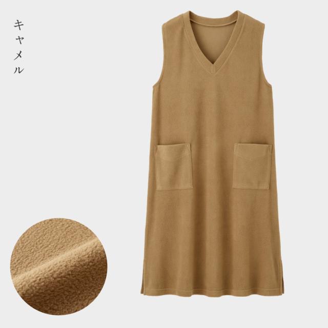 軽くて暖かいフリースジャンスカ。かぶるだけで即コーデ完成、普段使いからおでかけまで着回ししやすいワンピース。薄手で動きやすく、袖がないのでジャケットを羽織っても腕まわりが楽ちん。袖ぐり裏はストレッチテープ使いで伸びて袖通ししやすい。深めのVネックで脱ぎ着しやすい形です。