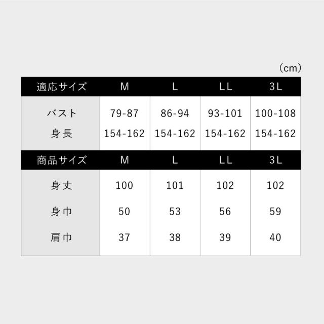 ■サイズ:身長154-162、M/バスト79-87、身丈100、身幅50、肩幅37、L/バスト86-94、身丈101、身幅53、肩幅38、LL/バスト93-101、身丈102、身幅56、肩幅39、3L/バスト100-108、身丈102、身幅59、肩幅40cm