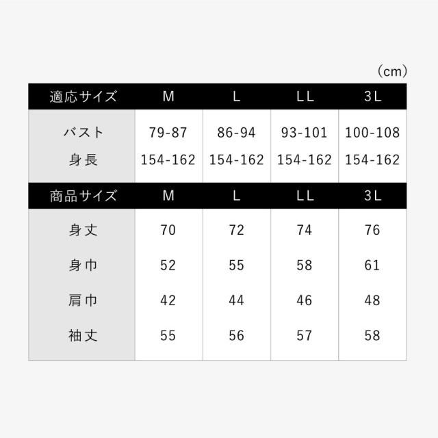 ■サイズ:身長154-162、M/バスト79-87、身丈70、身幅52、肩幅42、袖丈55、L/バスト86-94、身丈72、身幅55、肩幅44、袖丈56、LL/バスト93-101、身丈74、身幅58、肩幅46、袖丈57、3L/バスト100-108、身丈76、身幅61、肩幅48、袖丈58cm