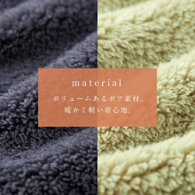 まるで毛布のような暖かさ。ボリュームあるボア素材のもふもふプルオーバー。毛布に包まれているような暖かさ。ボリュームたっぷりのボアが空気を含んで、暖かく軽い着心地。ふわふわの着やすい重ね衿で首元もポカポカです。