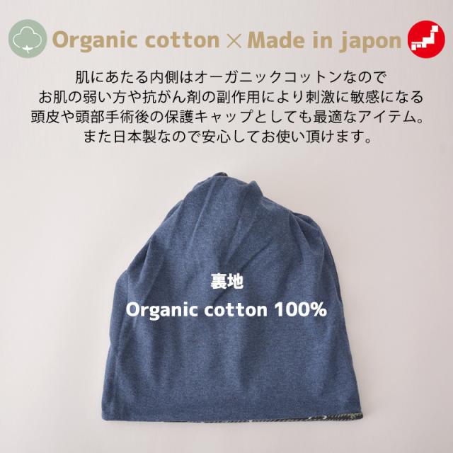 肌にあたる内側はオーガニックコットンなのでお肌の弱い方や抗がん剤の副作用により刺激に敏感になる頭皮や頭部手術後の保護キャップとしても最適なアイテム。