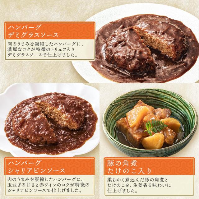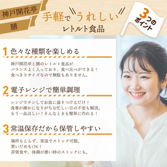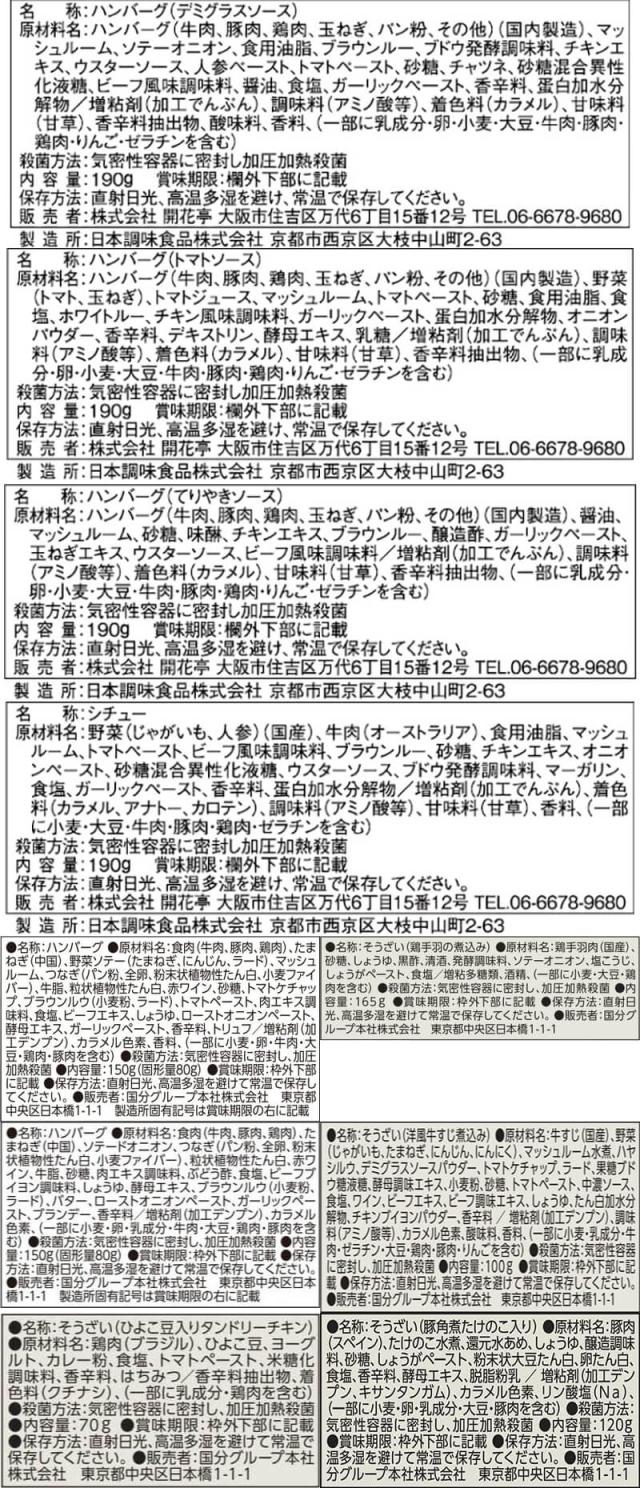 | 内容量 | ■ 神戸開花亭 煮込みハンバーグ デミグラスソース 190g 煮込みハンバーグ トマトソース 190g 煮込みハンバーグ テリヤキソース 190g ビーフシチュー 190g (製造日より240日) ■まごころを食卓に 膳 ハンバーグ デミグラスソース 150g 鶏手羽の黒酢煮 165g (製造日より 365日) ハンバーグ シャリアピンソース 150g 洋風牛すじ煮込み 100g ひよこ豆入りタンドリーチキン 70g (製造日より 270日) 豚の角煮 たけのこ入り 120g ( 製造日より 240日) 10種 10食 製造メーカーからの仕入商品の為 賞味期限はお届け時のものではございません。 予めご了承くださいませ。 |