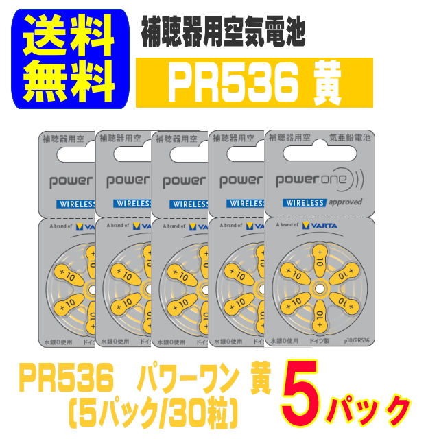 補聴器 電池 PR536 (10A) 黄 5パック(30粒) パワーワン 普通郵便 送料無料 無水銀タイプ 空気電池 空気亜鉛電池 power one 世界共通 補聴器各社対応 補聴器電池 ボタン バッテリー