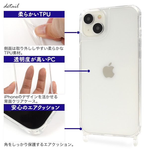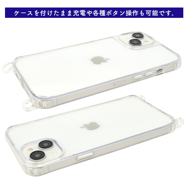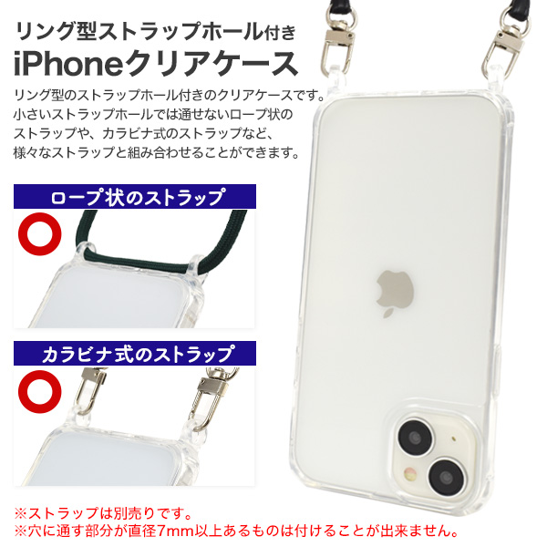 リング型のストラップホールは、小さいストラップホールでは通せないロープ状のストラップや、 カラビナ式のストラップなど様々なタイプのストラップと組み合わせることができます。 リング部分とケースが繋がっているので、金具と違い外れにくく、丈夫な作りになっています。 側面はソフトなTPU素材で着脱簡単!背面はiPhoneのデザインを活かせるクリアケースで、 角にはエアクッション付き!衝撃やキズなどからiPhoneを守るのはもちろん、 カメラや各種ボタンなどケースに入れたまま操作可能です。 ※ストラップは別売りです。 ※穴に通す部分が直径7mm以上あるものは付けることが出来ません。 | ||||||||||||