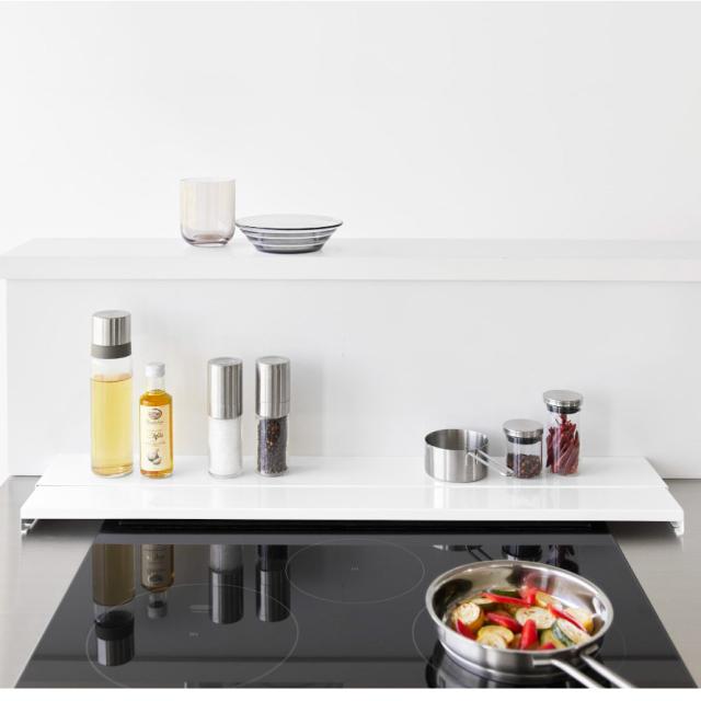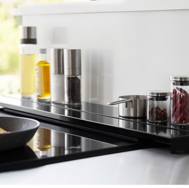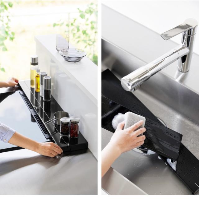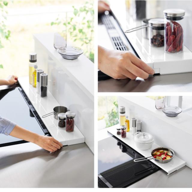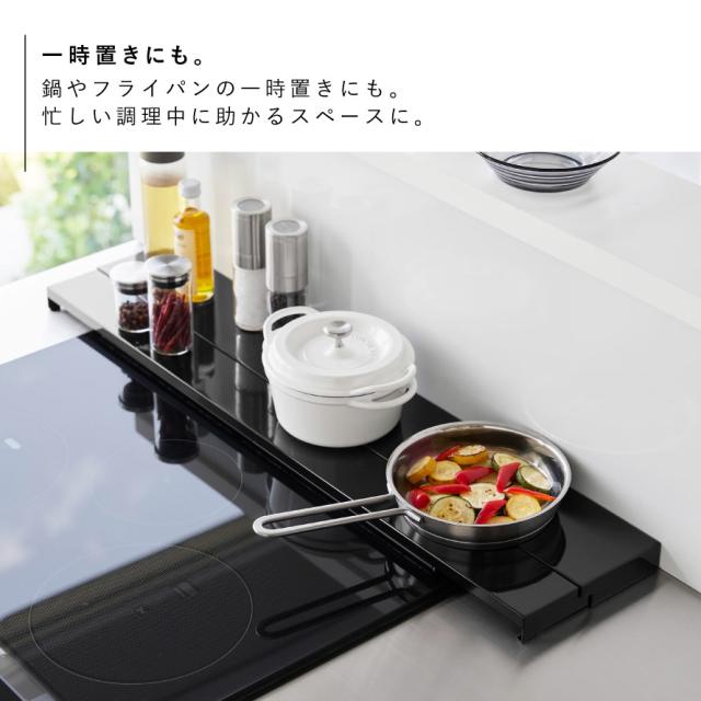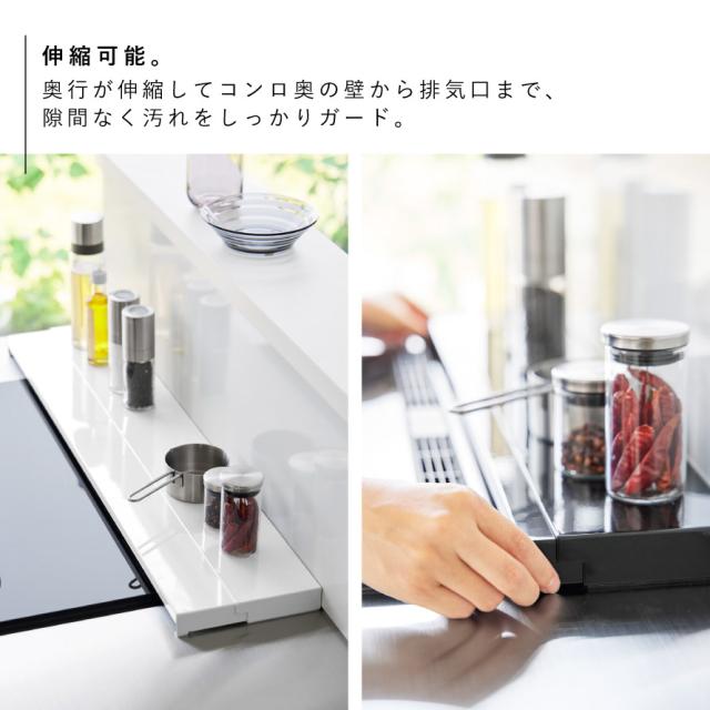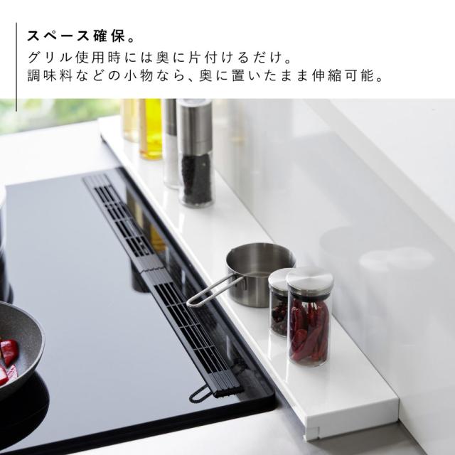 排気口に置くだけの簡単設置。奥行が伸縮するのでコンロ奥の壁から排気口まで、隙間なく汚れを防止。飛び散る油はね・調理くずなどの汚れをしっかりガードします。排気口との隙間に調理くずなどが入りにくいうよう、低い高さ設計です。グリル使用時には奥にスライドさせるだけ。調味料などの小物であれば、奥に置いたまま伸縮できます。奥行最大約16.5cmまで伸びるので大きめの鍋やフライパンなどの一時置きにも便利。
