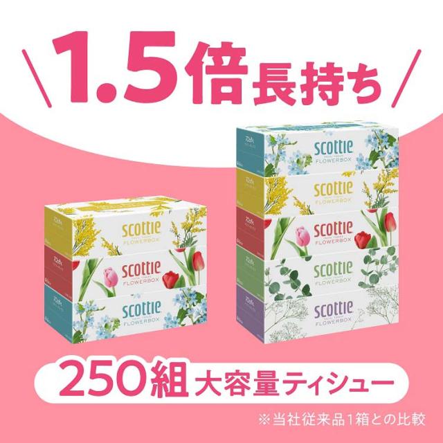 ●「長持ち」&「コンパクト」の1箱250組入りのスコッティフラワーティシューボックス。