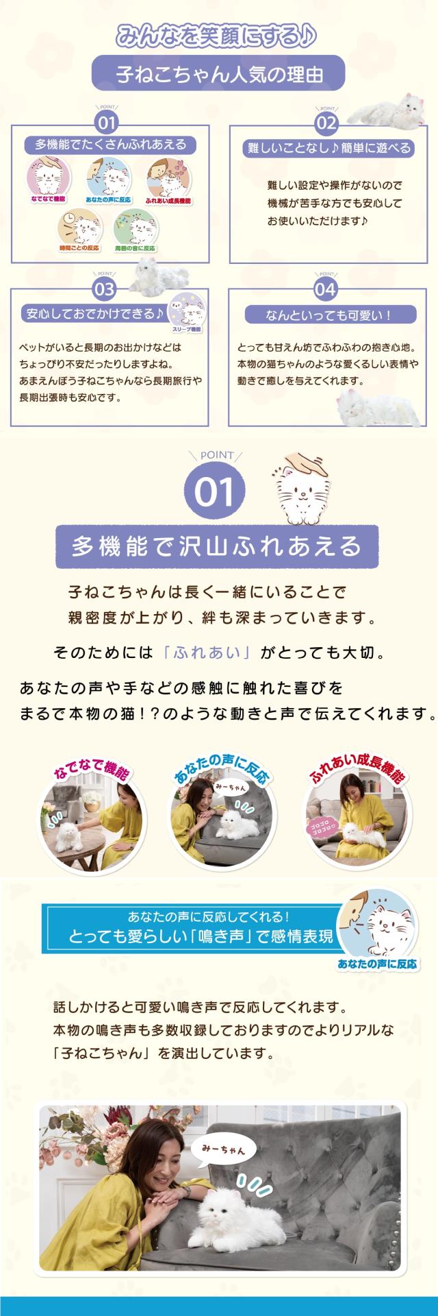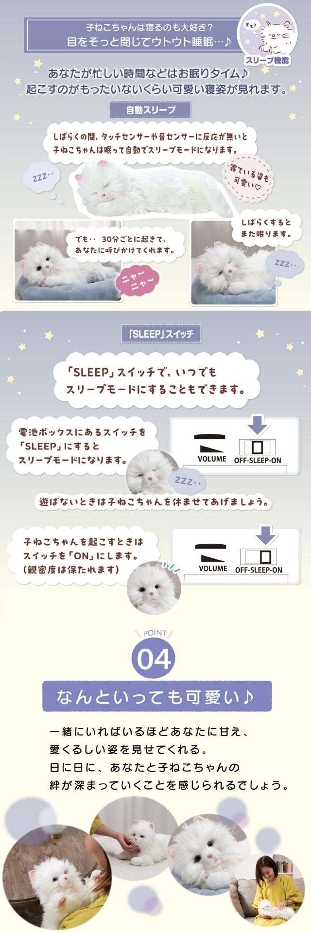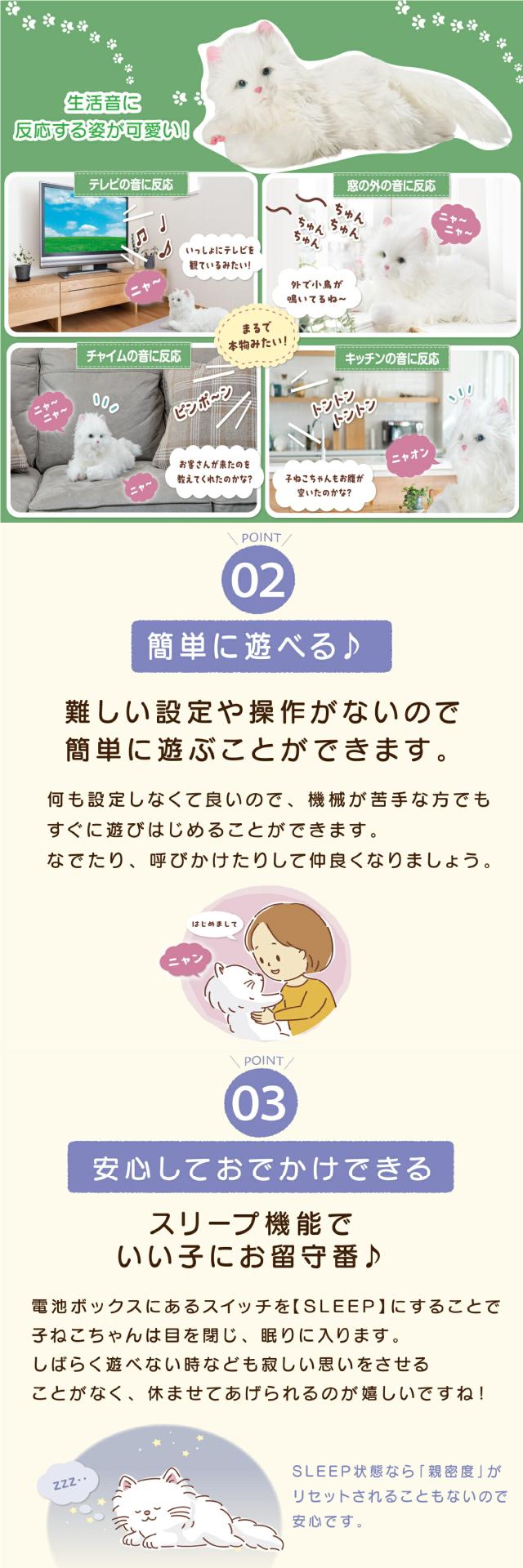 本物の鳴き声も多数収録していることで、よりリアルな「子ねこちゃん」を演出します。