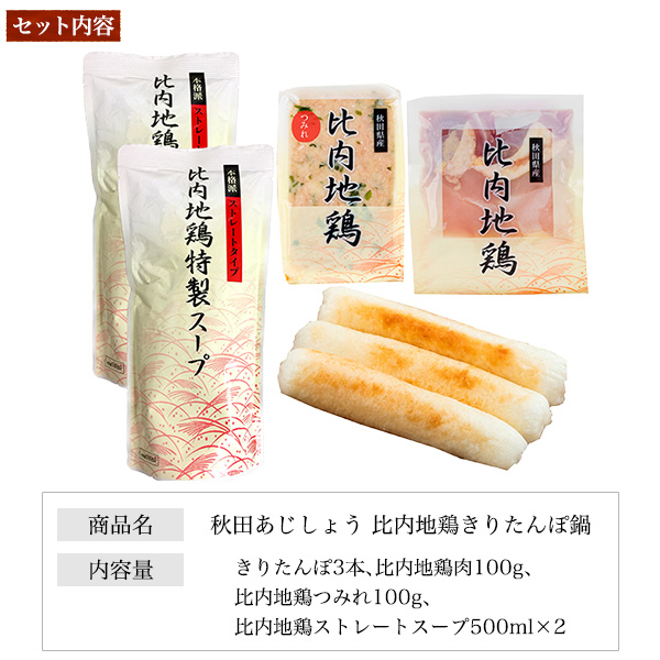 【内容量(約)】きりたんぽ3本×2、比内地鶏肉100g 比内地鶏つみれ100g、比内地鶏スープ500ml×2