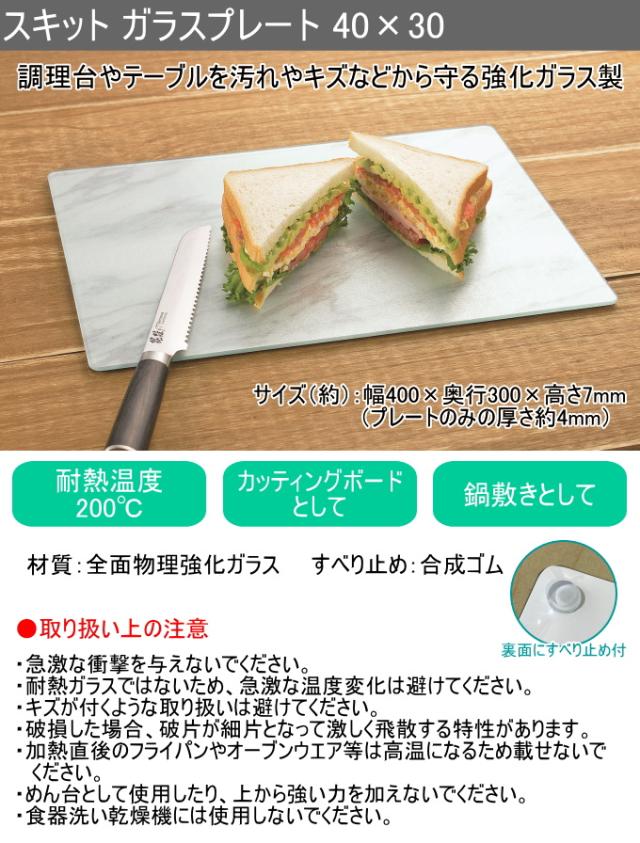 スキット ガラスプレート 40×30cm 1枚 HB-6930 強化ガラス 調理台 傷防止 汚れ防止 カッティングボード 鍋敷き