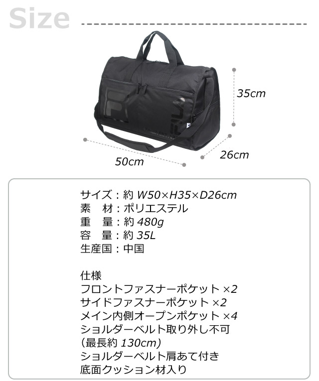 ![]() ![]() ![]() ![]() ・FILA(フィラ)ダブルロゴ 35リットルで小ぶりのボストンバッグ フロントポケットが付いていて便利。小型でジムやスポーツにちょうどいいサイズ。 通学・部活・修学旅行・林間学校・自然学校・キャンプ・宿泊・合宿など・・・様々なシーンで活躍間違いなし