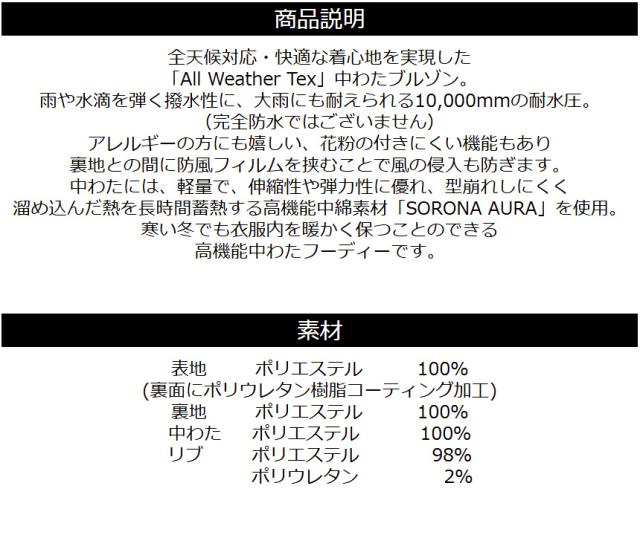 耐水圧10000mm!溜め込んだ熱を長時間蓄熱する高機能中綿素材「SORONA AURA」を使用した全天候対応の中わたフーディー M L LL 25AW