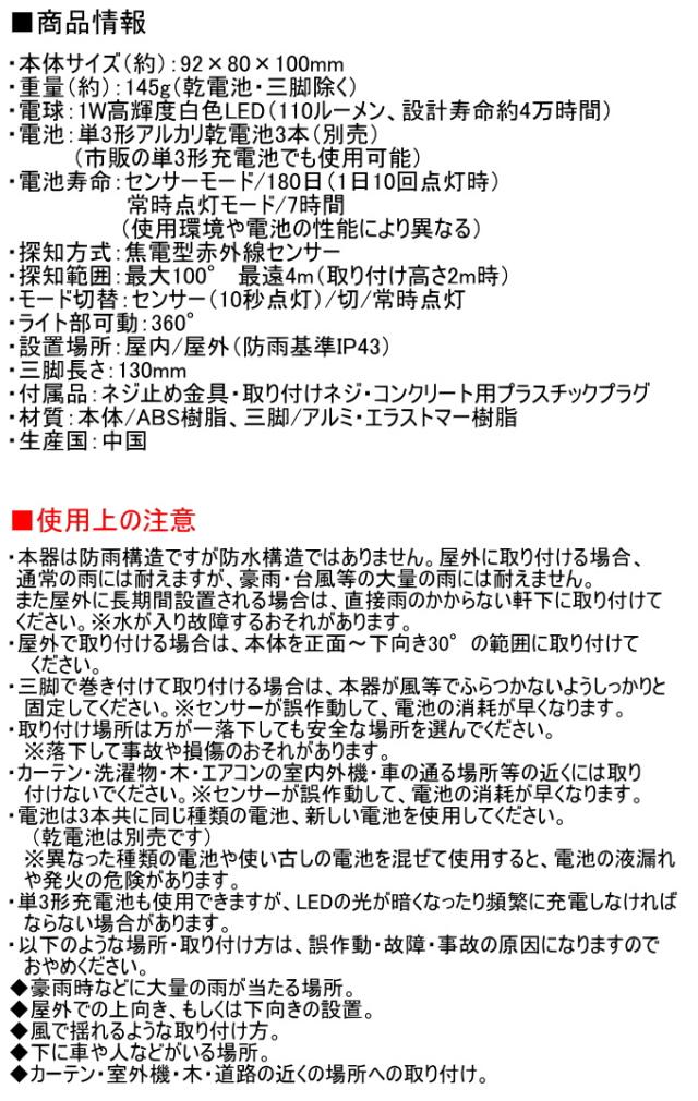 センサーモード:180日(1日10回点灯時) 常時点灯モード:7時間(使用環境や電池の性能により異なる) |