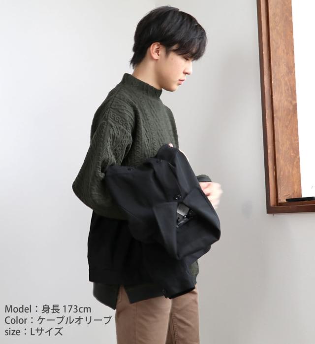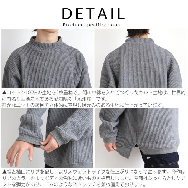 ■ Audience オーディエンス 商品詳細 Audience人気素材の一つ。コットンキルトシリーズから人気のモックネック。 裾と袖口にリブを配し、よりスウェットライクな仕上がりになっております。今作はリブのカラーをよりボディの色味に近いものを採用しました。 表面はふっくらとしたソフトな弾力があり、ゴムのようなストレッチを兼ね備えており、ストレスフリーな着用感も大きな魅力。 ドロップショルダーにボックスシルエット。リラックスしたシルエットが今作のポイントでもありますね。 浅めに入ったサイドスリットもしっかりと着こなしのアクセントになってくれます。 人気素材になりましたコットンキルト。素材についても触れておきます。 コットン100%の生地を2枚重ねで、間に中綿を入れてつくったキルト生地は、世界的に有名な生地産地である愛知県の「尾州産」です。 細かなニットの網目を立体的に表現し暖かみのある生地に仕上がっています。 程よい厚みで暖かく、また伸縮性のある生地なので動きやすさも兼ね備えております。 継続のストライプ柄のようなコットンキルト。縦に縫われて接結されたキルトは、ストライプ柄のような表情。 そしてケーブル柄。ぼこぼこと立体的に細かなニットの網目を表現しています。ニットよりも手軽に着られる、丈夫でロングシーズンお楽しみいただける素材です。 ご家庭の洗濯機で気軽に洗えるのも嬉しいポイントです。 |