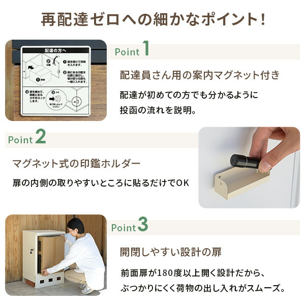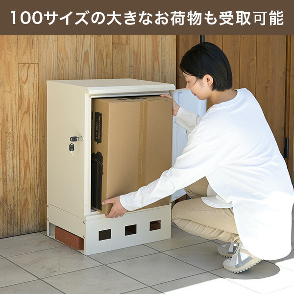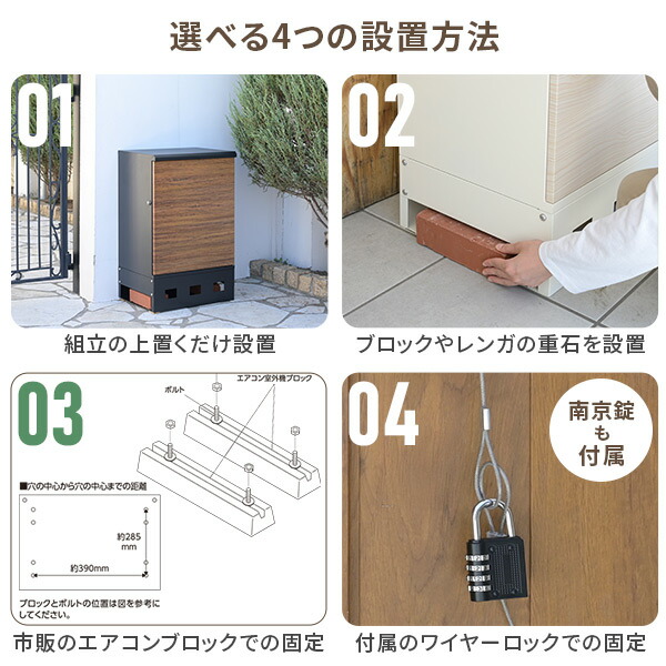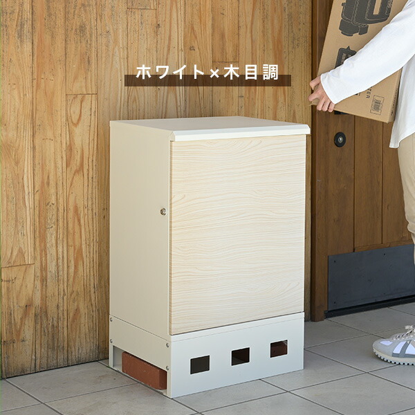 | 商品説明 | ●簡単組立の宅配ボックス 1段タイプ ●屋外設置が可能な防雨設計(防水規格 IPX4取得) ●雨の水滴から宅配物を守ります ※完全防水ではありません ●大容量:約70L ※最大 41×33×51.5cmまで投函可能 ●宅配サービスの規格対応サイズ:100サイズ ※あくまで目安となります ●地面の結露や湿気、ホコリから荷物を守る底上げ仕様を採用 ●ブロックやレンガなどの重石を設置できるのでアンカー不要 ●市販のエアコン室外機ブロックを使用して取付可能 ●本体底部には結露から荷物を守るための穴付き底板仕様 ●アウトセット扉を採用することで正面から本体の側板が見えずスタイリッシュな見た目に ●おうちに馴染むシンプルな木目調デザイン ●高級な風合いの大理石調デザイン ●シリンダーワンプッシュ錠:簡単操作で押すだけで施錠可能 ●宅配業者様向けメッセージプレートと印鑑置きは磁石で好きな位置に貼り付けが可能 ●盗難・転倒防止用ワイヤー付属 ●付属品:印鑑置き(マグネット2個付き)、宅配業者様向けメッセージプレート(マグネット)、鍵×2本、盗難防止用ワイヤー(ダイヤル式鍵付き)、プラスドライバー ※2025年3月より、販路限定カラーのブラック/大理石調を追加しました |