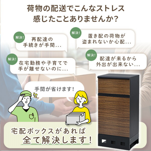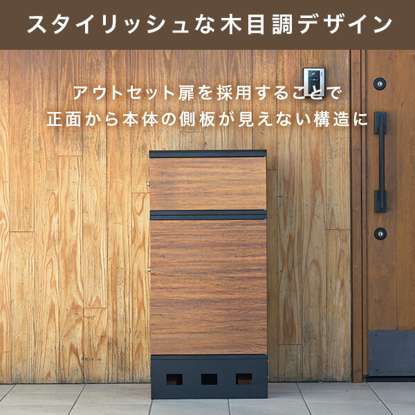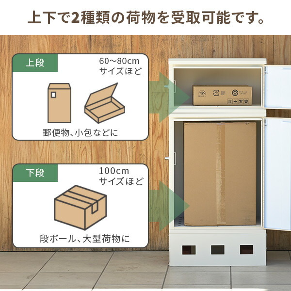 | 商品説明 | ●簡単組立の大容量2段タイプの宅配ボックス ●屋外設置が可能な防雨設計(防水規格 IPX4取得) ●雨の水滴から宅配物を守ります ※完全防水ではありません ●大容量:(上段)約24L、(下段)約70L ※最大 (上段)41×33×18cm、(下段)41×33×51.5cmまで投函可能 ●宅配サービスの規格対応サイズ:(上段)60-80サイズ、(下段)100サイズ ※あくまで目安となります ●地面の結露や湿気、ホコリから荷物を守る底上げ仕様を採用 ●ブロックやレンガなどの重石を設置できるのでアンカー不要 ●市販のエアコン室外機ブロックを使用して取付可能 ●本体底部には結露から荷物を守るための穴付き底板仕様 ●アウトセット扉を採用することで正面から本体の側板が見えずスタイリッシュな見た目に ●おうちに馴染むシンプルな木目調デザイン ●高級な風合いの大理石調デザイン ●シリンダーワンプッシュ錠:簡単操作で押すだけで施錠可能 ●宅配業者様向けメッセージプレートと印鑑置きは磁石で好きな位置に貼り付けが可能 ●盗難・転倒防止用ワイヤー付属 ●付属品:印鑑置き(マグネット2個付き)、宅配業者様向けメッセージプレート(マグネット)、鍵×2本、盗難防止用ワイヤー(ダイヤル式鍵付き)、プラスドライバー ※2025年3月より、販路限定カラーのブラック/大理石調を追加しました |