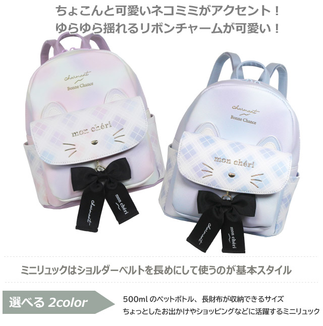ミニリュック 女の子 小学生 おしゃれ Pirica nonno チェックフェイス ミニDパック hdl-613 リュック 高学年 中学生 ミニ 小さめ かわいい 韓国ファッション バッグ オルチャン 低学年 黒 パープル ガーリー ジュニア キッズ 女子 ネコミミ ねこ 猫 キッズリュック