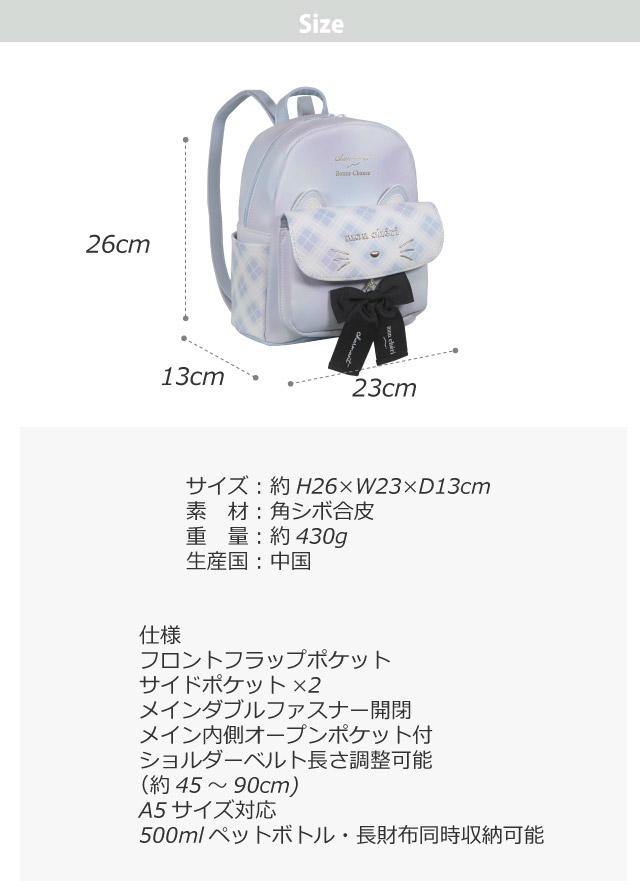 ![]() ![]() ![]() ![]() ![]() ・Pirica nonno ピリカノンノ チェックフェイス ねこフェイスがかわいいミニリュック。 フロントのリボンもポイント。 小学生の女の子に大人気のリュックサックです。 人気のオルチャンファッションにもよく似合います。 ちょっとショルダーを長めにしてルーズに背負うといまどきコーデに 旅行・遠足・通園・通学・お出かけにおすすめ。 誕生日プレゼント・クリスマスプレゼントにも人気です。