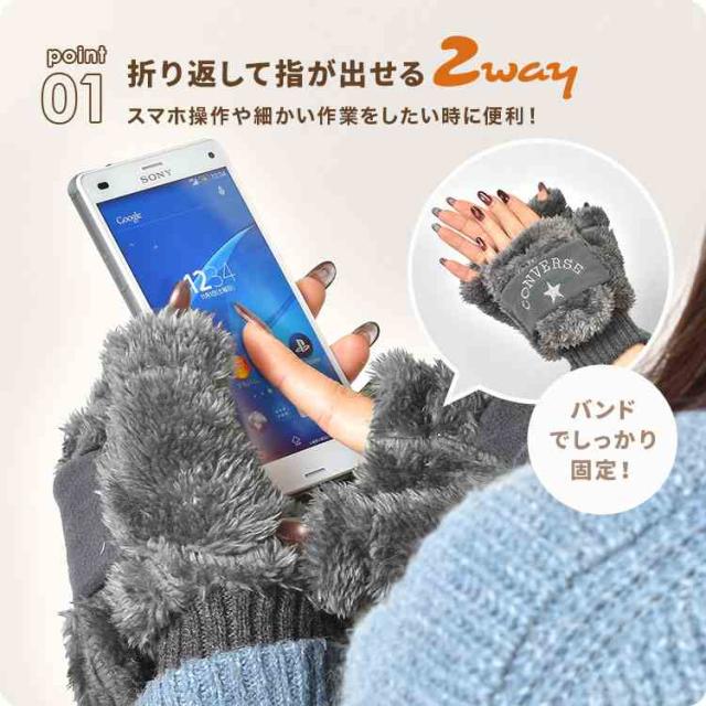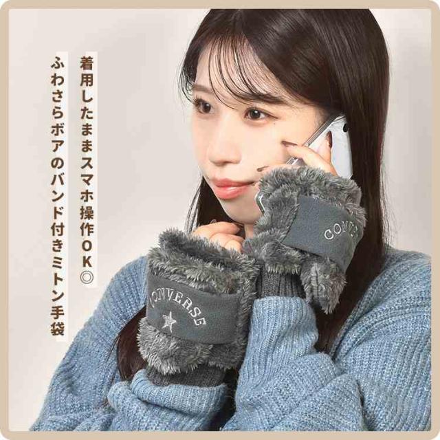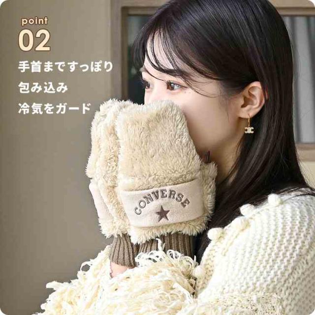 手袋 converse コンバース レディース スマホ対応 ミトン 指なし かわいい ボアミトン 冬 防寒 指先が出る 2way ふわふわ グローブ 通学 通勤 自転車 女子 友達 誕生日 プレゼント クリスマス ギフト ホワイト ベージュ グレー ブラウン チャコール 小学生 中学生 高校生