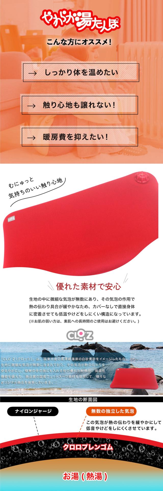 CLO’Z(クロッツ)やわらか湯たんぽは、ウェットスーツ用のクロロプレンゴムに、ナイロンジャージを貼った生地で作られており、非常にやわらかくて肌触りがよく、断熱性が高いため、保温性に優れています。生地の中に微細な気泡が無数にあり、その気泡の作用で熱の伝わり具合が緩やかなため、カバーなしで直接身体に密着させても低温やけどをしにくい構造になっています。(※お肌の弱い方は、素肌への長時間のご使用はお避けください。)