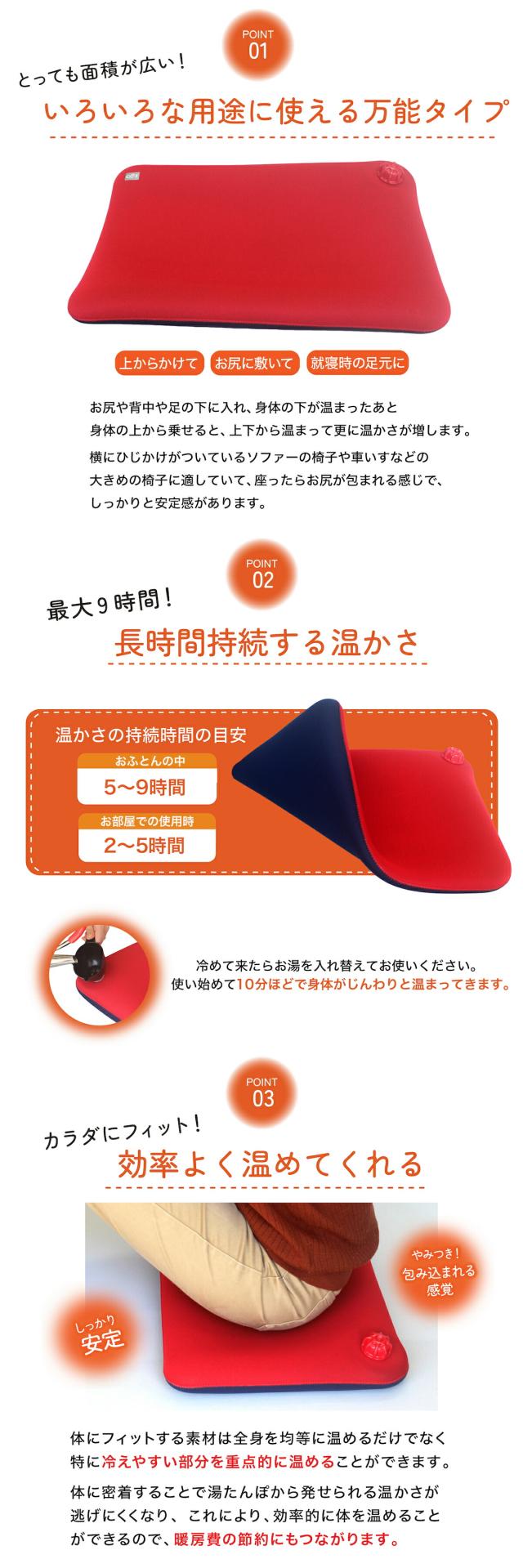 ヒザ掛けとしても活躍する座ぶとんタイプの湯たんぽ