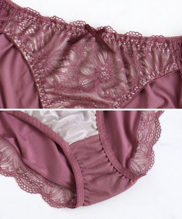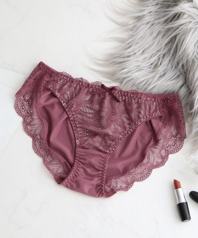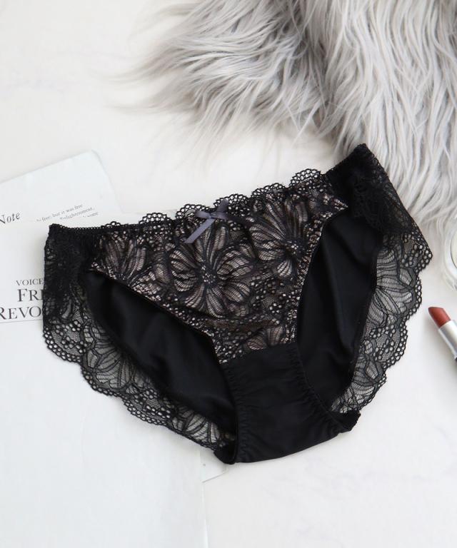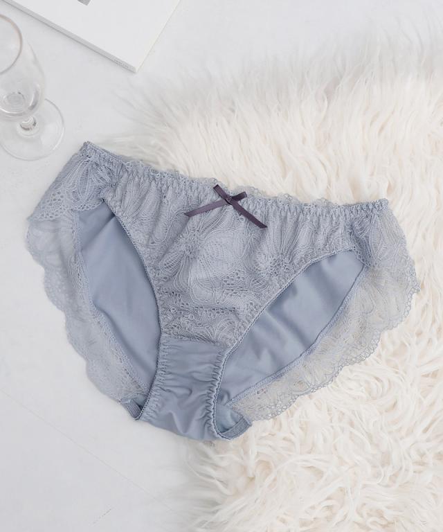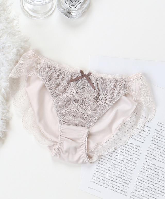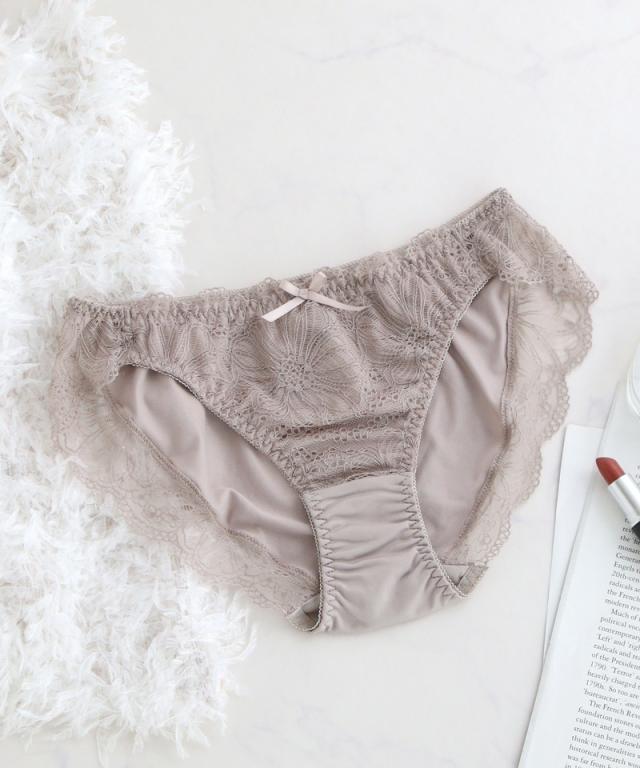 大判なダリアレースがヒップを優しく包みこんでくれる。 甘すぎないエレガントなデザインが、ノーブルな雰囲気を紡ぎ出す。 贅沢にレースを使用した、履き心地の良いフルバックタイプ。 |