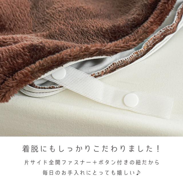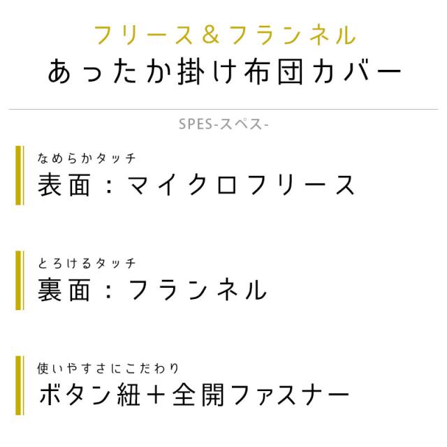 | ・なめらかフリース 軽くてあったかいフリースはもはや冬の定番素材。そんなフリースも、やっぱり年々進化を遂げているんです。普通のフリースよりももっと滑らかに仕上げた「マイクロフリース」は、ずっしりとした重みを軽減しつつ、心地よい温かさで眠りをサポート。 ・とろけるフランネル毛足の長いフランネルは、冬のもこもこしがちなパジャマにまとわりつかず、快適に過ごせる生地です。裏面はふわさらっとしたうっとりタッチで、肌触りが良いです。パジャマに寝具がまとわりつくのが煩わしい方におすすめです。 ・一枚二役一枚で使えば毛布としても使えます。ワンルーム等収納スペースがなかなかとれずにお困りの方は、カバーで毛布も兼用もオススメ。 ・着脱にもしっかりこだわりました!全開ファスナー+ボタン付きの紐だから毎日のお手入れにとっても嬉しい♪ | |
