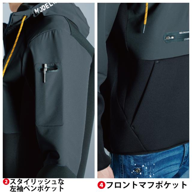 ◇フードや前身上部・腕上部それぞれに防風性を兼ね備えた布帛素材を使用