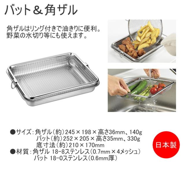 本体:鉄(底の厚さ0.8mm) 取っ手:鉄クロムメッキ 手付きフライヤー:18-8ステンレス(0.7mm×4メッシュ) フライヤー油はねガード:18-8ステンレス(0.16mm×50メッシュ) 角ザル:18-8ステンレス(0.7mm×4メッシュ) バット:18-0ステンレス(0.6mm厚) |
