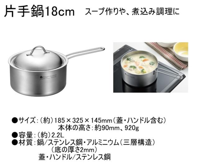 鍋の本体は熱伝導性に優れたアルミニウムを耐久性と保温性に優れたステンレス鋼でサンドした3層構造(3LAYERS)で、軽量で扱いやすく、外面のサテン仕上げにお洒落なロゴ入りです。 IHはもちろん、ガス火やオーブン調理、アウトドアでの焚火や炭火にも対応します。 ハンドルと蓋をオールステンレス製にすることで耐久性に優れお手入れも簡単でそのままオーブンに入れての調理や、食洗機にも対応します。 片手鍋とオーバルパンのセットです。 ※ハンドルは調理中や調理後は、熱くなりやすいため、ミトンや鍋つかみを使用してください。 |