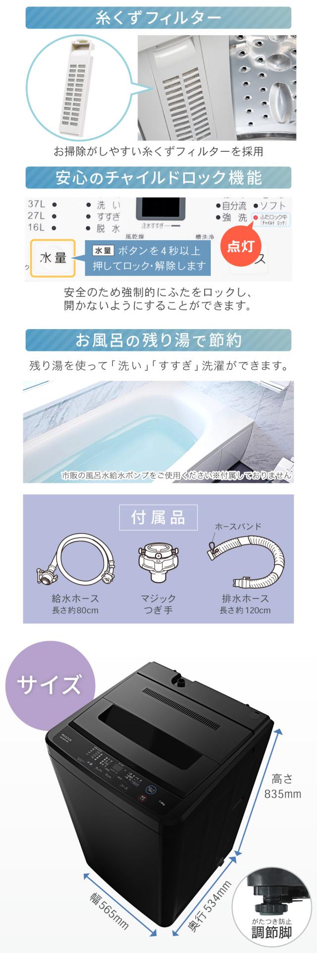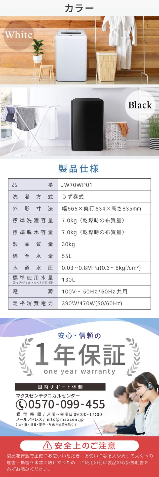 洗濯機 7kg 全自動洗濯機 7.0kg 一人暮らし 風乾燥 槽洗浄 凍結防止 チャイルドロック 急速洗いブラック 黒 JW70WP01BK DJW70WP01BK マクスゼン