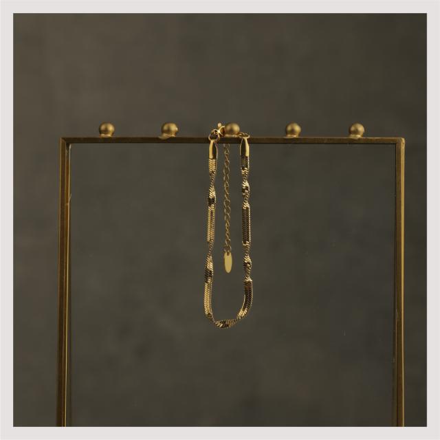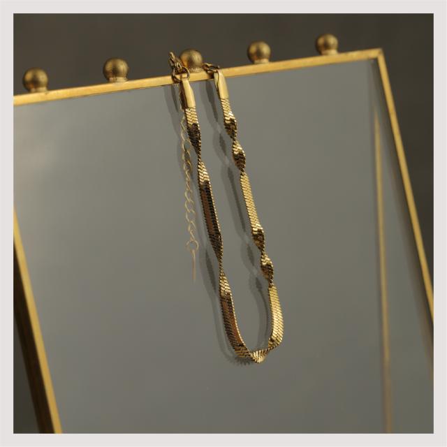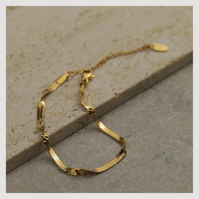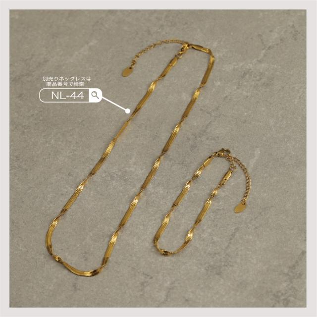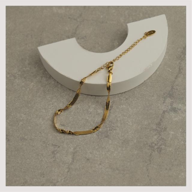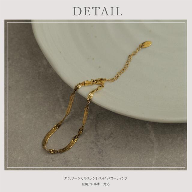 特徴:煌めくスネークチェーンが魅力のブレスレット。ねじれたツイストデザインが独特な輝きを放ちます。サージカルステンレス製で耐久性抜群、18Kコーティングで長く美しさをキープ。シンプルながら洗練されたデザインは、どんなスタイルにもマッチします。同デザインのネックレスもラインナップされていますので、トータルコーディネートを楽しめます。一点で大人の魅力を引き立てる、おしゃれなブレスレットです。