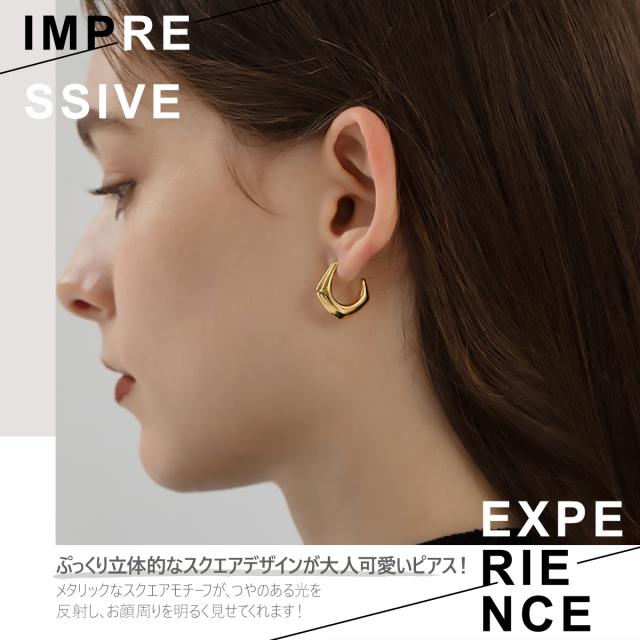 特徴:ぷっくり立体的なスクエアデザインが大人可愛いピアス!メタリックなスクエアモチーフが、つやのある光を反射し、お顔周りを明るく見せてくれます!