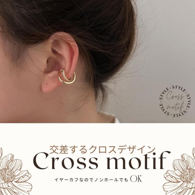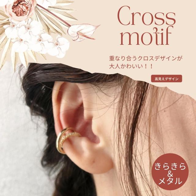 特徴:交差するクロスデザインが特徴のイヤーカフ。メタルとキラキラの融合で、とても可愛いスタイルで様々なシーンでご使用いただけます。