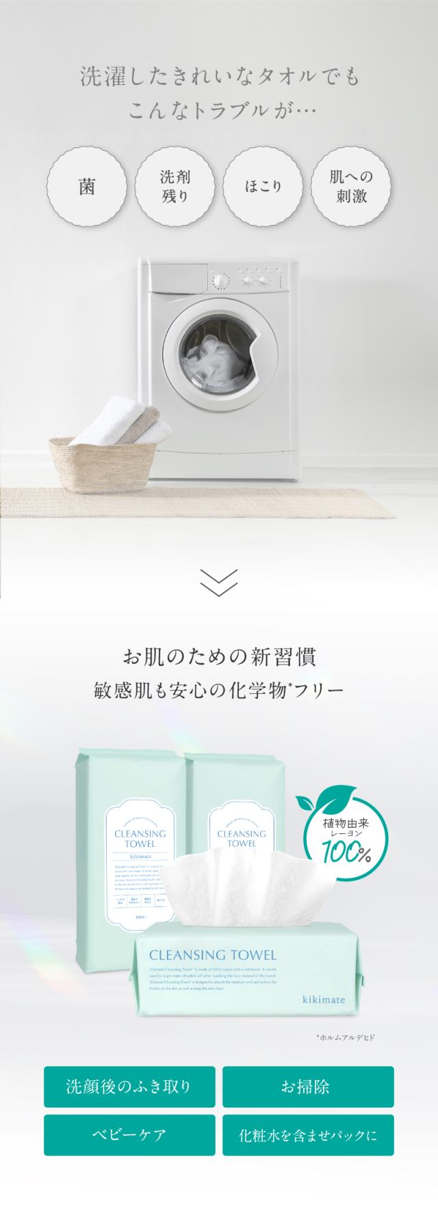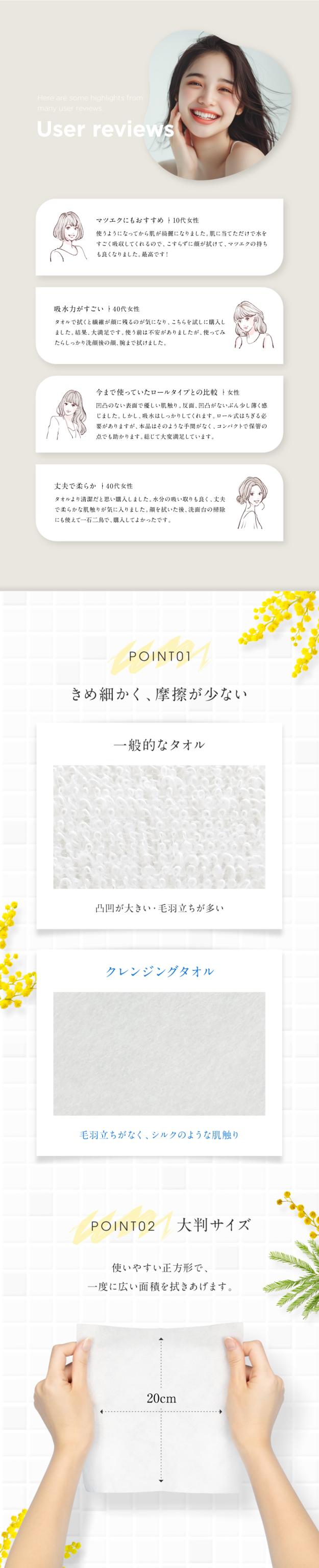 洗濯したきれいなタオルでも『雑菌』『洗剤残り』『ほこり』、荒い繊維により『摩擦による肌への刺激』で肌トラブルが生じる可能性があります。クレンジングタオルは使い捨てタイプでとても衛生的。繊維残りせず、コットンのようなきめ細かな生地で摩擦も防げるため、洗顔後のデリケートな肌をやさしく包み込みます。