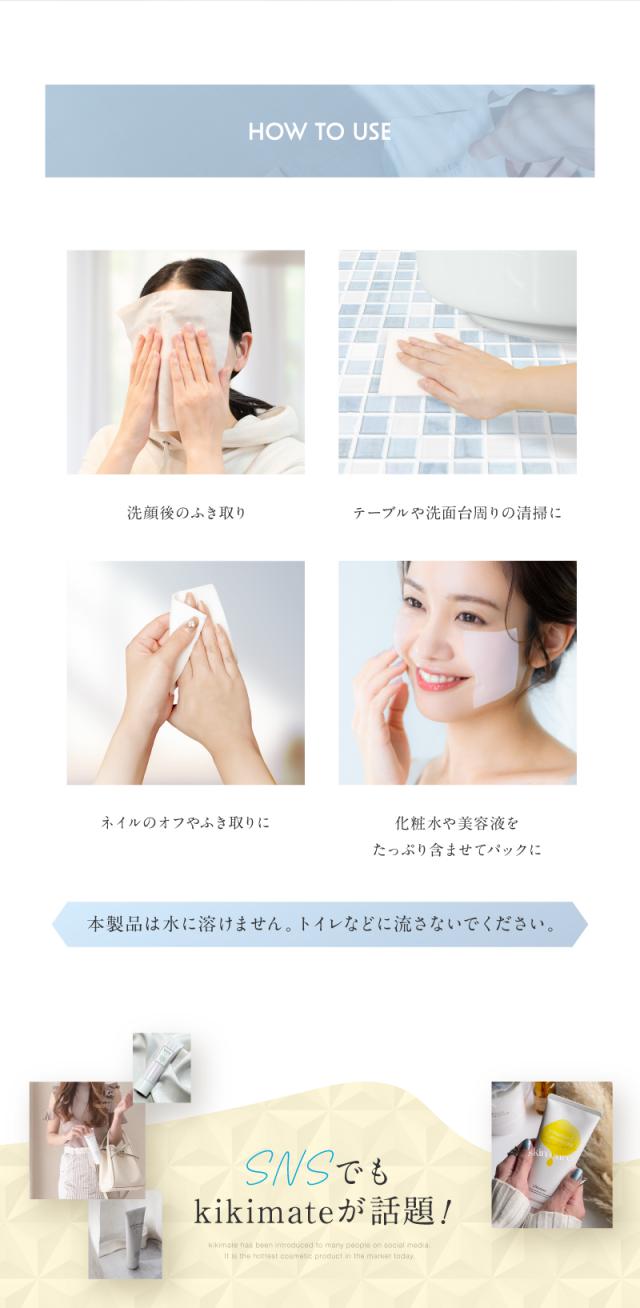 洗顔後タオル代わりに使うことはもちろん。テーブルや洗面周りの清掃、ネイルのオフやふき取り、化粧水や美容液をたっぷり含ませてパック、もしもの時に必要な衛生用品としても幅広く使用いただけます。