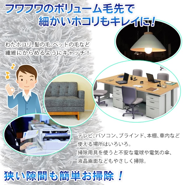 | ※本品は室内用です。野外では使用しないでください。 ※必ず乾いた状態でご使用ください。 ※ホコリが取りにくくなったらゴミ箱などの上で払い落としてください。 ※モップ部分は曲がりますが、ポール部分はは曲がりません。 ※ポールには多少しなりが発生します。最長で使用される場合はご注意ください。 ※生産工程上ポールに油が付いている場合があります。その際は拭き取ってお使いください。 ※根元で曲げすぎると折れる場合がありますので根元から曲げないようにご注意ください。 | |
