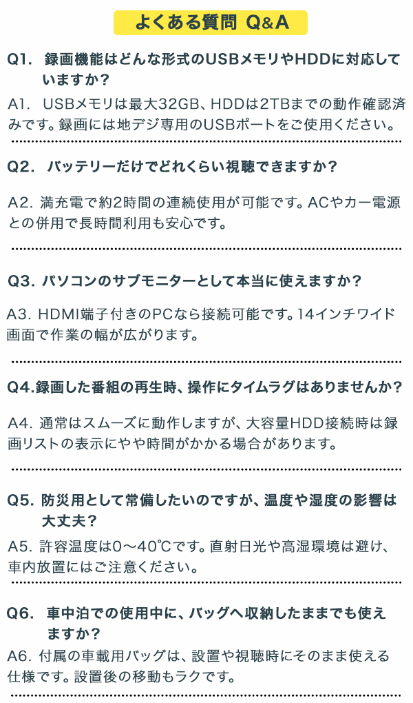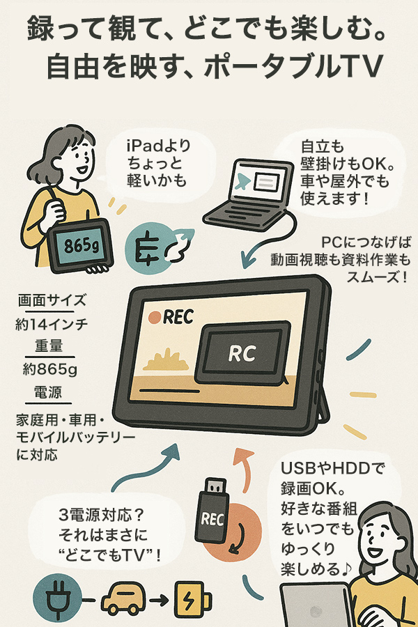 テレビの楽しみを、もっと自由に、もっと身近に。 今、「14インチ録画機能付きポータブルTV」が注目を集めている理由は、 “好きな番組を、いつでも・どこでも楽しみたい”というニーズに応える、新しいテレビのカタチだからです。 録画・再生・サブモニターとしての活用まで、多機能をギュッと一台に凝縮。 自宅・車・アウトドアなど様々なシーンでの使い勝手から、実際に使ってみて分かった“リアルな満足度”まで、 余すことなくお届けします。 \14インチ録画機能付きポータブルTVのここがポイント/ ■どこでも楽しめる3電源対応 家庭用・車用・バッテリーの3電源方式で、家でも車でもアウトドアでも自由に使えます。 ■録画機能で見逃しゼロ USBメモリやハードディスクにテレビ番組を録画できるので、好きな番組をいつでも好きな時に楽しめます。 ■サブモニターとしても活躍 HDMI接続でパソコンのサブモニターとしても利用でき、テレワークや動画視聴の幅が広がります。 ■多彩な設置スタイルと軽量設計 自立スタンド・壁掛け・車載バッグ付属で、どんな場所にも簡単に設置でき、約865gの軽量ボディで持ち運びもラクラク。 ■こんな人におすすめ ・一人暮らし・単身赴任で“自分専用テレビ”を探している人 ・キッチンや寝室など移動しながらテレビを観たい人 ・家族でチャンネル争いを避けたい人 ・アウトドア・車中泊などアクティブな趣味を楽しむ人 ・サブモニターやメディア再生機器を兼ねたい人 ・非常時の情報源としてテレビを備えておきたい人 ■注目ポイント1:【録画も再生もおまかせ】“ポータブル”の枠を超えたエンタメ端末 地デジ放送を録画して、好きな時に・好きな場所で再生可能。 USBメモリやHDDを使って番組録画でき、動画・音楽・画像ファイルの再生にも対応しています。 まさに「録画プレイヤー+テレビ+メディアビューアー」が一体になった、万能エンタメ端末。 注目ポイント2:【HDMI入力&3WAY電源】サブモニターにもなる万能性 ノートPCやゲーム機とHDMI接続すれば、14インチのサブモニターとして活用可能。 しかもAC/カー/バッテリーの3電源対応で、設置場所や電源状況を選ばず、屋外や車中泊、防災時にも安心。 ■使用レビュー 【キッチンで】 調理中に自立スタンドで設置し、ながら視聴。水跳ねにも強く、料理の時間が娯楽タイムに変わりました。 【アウトドアで】 キャンプ場で録画したスポーツ中継を観戦。バッテリー駆動+車載バッグ付きで設置も簡単、テントの中が“映画館”に。 【書斎で】 HDMIでノートPCに接続し、サブモニターとして活用。作業中にサブでYouTubeを流す“ながら使い”にピッタリでした。 【スタッフVoice】 これ1台あれば、家じゅうどこでも“好きな番組”が観られる。 据え置きテレビとは違い、好きな番組を“持ち運べる”という自由度と楽しさに正直驚きました。 録画や再生はもちろん、HDMI接続でサブモニターとしても使える柔軟性、そしてAC・車・内蔵バッテリーの3電源対応と、 どんなシーンにもフィットするマルチな活用力が光ります。約865gと軽量コンパクトな設計に加え、 14インチワイドの見やすい画面サイズも、テレビをもっと身近にしてくれるポイントです。 一方で、バッテリーでの連続視聴時間が約2時間とやや短めである点や、大容量の外付けHDDを使用する場合、 録画リストの表示に時間がかかることがあるなど、使用環境によっては注意が必要な面も見受けられました。 「録画も、視聴も、サブモニターも。」 これ1台で叶う“好きな場所で好きな番組を楽しむ自由”。 据え置きテレビでは得られない、このポータブルTVならではの価値が、 あなたの暮らしに新しい楽しみ方をもたらしてくれるはずです。 次のテレビは、“持ち運べること”が新常識になるかもしれません。 【商品特徴・キーワード】 14インチ ポータブルテレビ 録画機能付き テレビ 車載用 ポータブルTV 地デジ録画 テレビ HDMI サブモニター テレビ アウトドア テレビ 3電源対応 テレビ 【サイズ】 外形寸法:約W336×D26.5×H207mm 【重量】 本体重量:約865g 【仕様】 電源:ACアダプター入力AC100-240V,50/60Hz/出力DC12V,1,5A カーアダプター入力DC12V/出力DC12V,1.5A バッテリー2000mah,7.4V(満充電時間約3.5〜4時間、連続使用時間約2時間) 待機消費電力:1W以下 消費電力:約18W スピーカー:2W×2(ステレオ) 入力端子:アンテナ、DC電源、USB×2(番組録画、メディア再生)AV、HDMI、miniB-CASカードスロット 出力端子:イヤホン(ステレオミニピン3.5Φ) 対応フォーマット:音声 MP3/WMA/WAV/AAC 動画 MPG4/WMV/AVI/3GP 画像 JPEG/BMP テキスト TXT ※上記形式でも再生できない場合があります。 ※すべての再生の保証はしてをりません。 受信周波数:地上デジタルUHF(13〜62ch)(フルセグ/ワンセグ) ※インターネット回線を利用した地デジ受信環境には非対応 液晶パネル:タイプ TFT-LCD サイズ 14インチ フレームレート 60Hz アスペクト比 16:9 解像度 1366×768画素 コントラスト比 500:1(Typ.)TM 輝度 220cd/? 応答速度 8(Typ.)(Tr+Td)ms 視野角