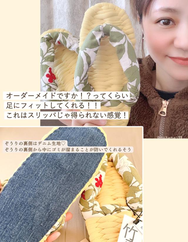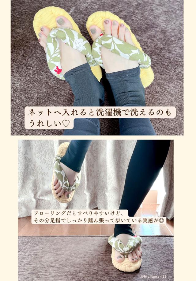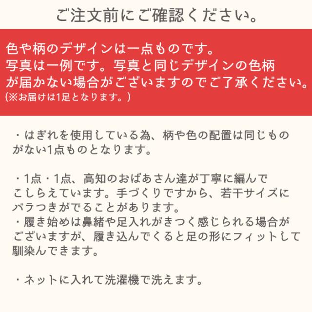 高知のおばあさんが手編みした、やわらかくさらっと気持ちいい布ぞうり。 夏でも蒸れにくく、手編みならではの履き心地。 世界にひとつだけのオンリーワンな一足。 ■ブランド:竹春(TAKEHARU) ■メイン素材:布 ■原産地:日本製、高知県産 ■実寸サイズ:(約)縦23.5〜24cm×横8.5〜9cm×高さ2cm 手編みの為、仕上がりに5mm前後サイズ差がございます。 ■適応サイズ:(約)22.5〜24.5cm フリーサイズとなりますので、表記しているサイズは目安となります。 履き始めは鼻緒が窮屈に感じられますが、履き込むほど鼻緒が程よく伸び、足に馴染んできます。 <こちらの商品について> ・はぎれを使用している為、柄や色の配置は同じものがない1点ものとなります。 ・1点1点、高知のおばあさん達が丁寧に編んでこしらえています。手づくりですから、若干サイズにバラつきがでることがあります。 ・ぞうりは、履き始めは鼻緒がきつく感じられますが、履き込んでくると足の形にフィットするという特徴があります。 ・鼻緒が大きめに編まれていますので、やや小さいと思われても痛くありません。多少のサイズ違いはご了承願います。 ・ぞうりの裏側をデニム生地で縫製されていますので、ぞうりの裏側から中にゴミが溜まることが防げます。また見栄えが良く耐久性にも優れています。 <ご購入前にご確認ください> ・お届けは1足となります。 ・草履の色や柄のデザインは一点ものです。写真は一例ですので、写真と同じデザインの色柄が届かない場合がございます。予めご了承ください。 ・ネットに入れて洗濯機で洗えます。 <スタッフ所見> 履き始めはあれ?ちょっと小さいか?足入れがややキツイと思ってましたが、慣れてくると、足にピッタリはまるようになり、ちょうどの形になりました。 何と言っても、気持ちいい!!!親指と人差し指の間に鼻緒の刺激!また、鼻緒が大きく作られているので、全然痛くもないし、足の裏が適度の刺激で健康スリッパを履いているような感覚! 炊事、洗濯、リビング、食事の間や風呂上りにと、今ではいつも履いています。 裏地がデニム生地で縫製されているのがお洒落ですね。[2311r] |