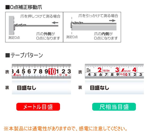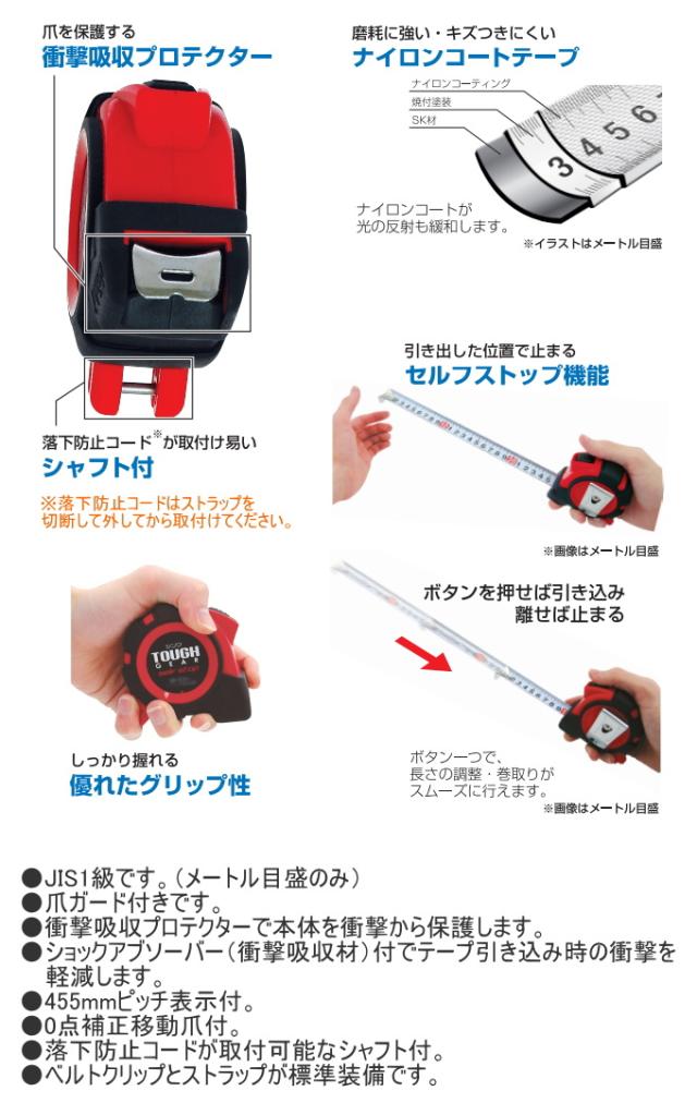 | 特徴 | JIS1級です。 摩耗に強く、キズつきにくいナイロンコートテープを採用しました。 引き出した位置で止まるセルフストップ機能付です。(ボタンを押すと引き込み、離すと止まります。) 爪ガード付き。 衝撃吸収プロテクターで本体を衝撃から保護します。 ショックアブソーバー(衝撃吸収材)付でテープ引き込み時の衝撃を軽減。 455mmピッチ表示付です。 0点補正移動爪付です。 落下防止コードが取り付け可能なシャフト付き。 ベルトクリップとストラップが標準装備です。 |