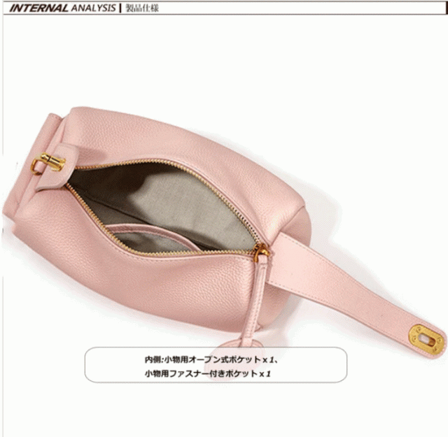 本牛革ハンドバッグ ショルダーベルトは取り外し自由で、用途にあわせてショルダーバッグ・ハンドバッグに変更できます。マチが広く出し入れに便利です。内側には小物用のポケットがファスナー式×1・オープン式×1と2つあり、鍵やパスケースなど細かい物をいれるのに便利です。