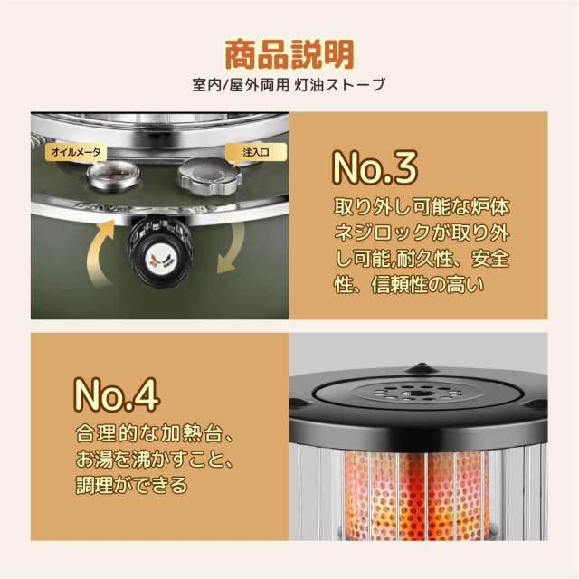 ★高効率燃焼:空気とほこりを取り除きます。ウィックタイプの燃料供給、最大100%の燃焼率です。丸い強化ガラスを使用すると、強化ガラスは燃焼中に発生する煙を抑えることができます。