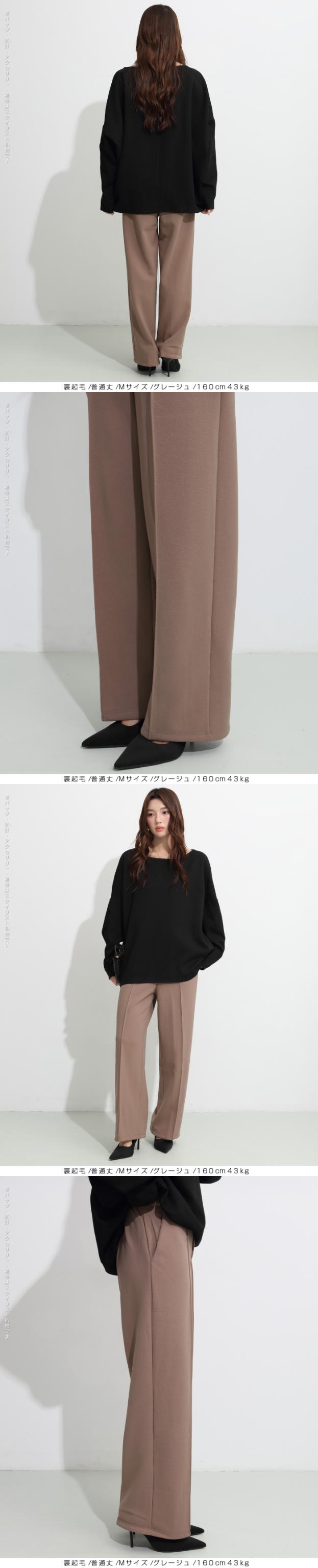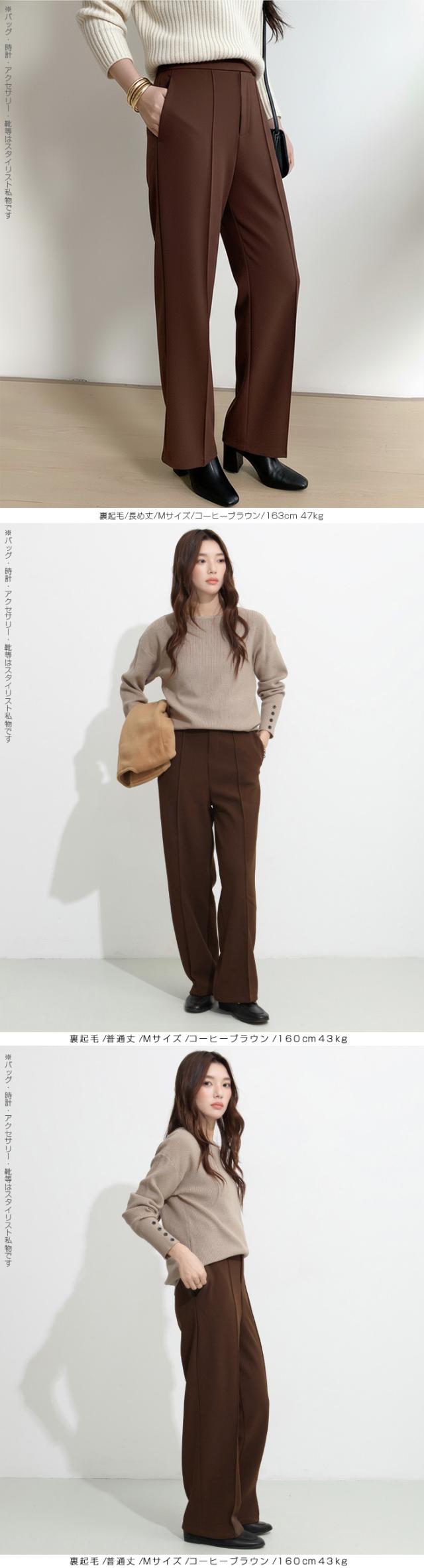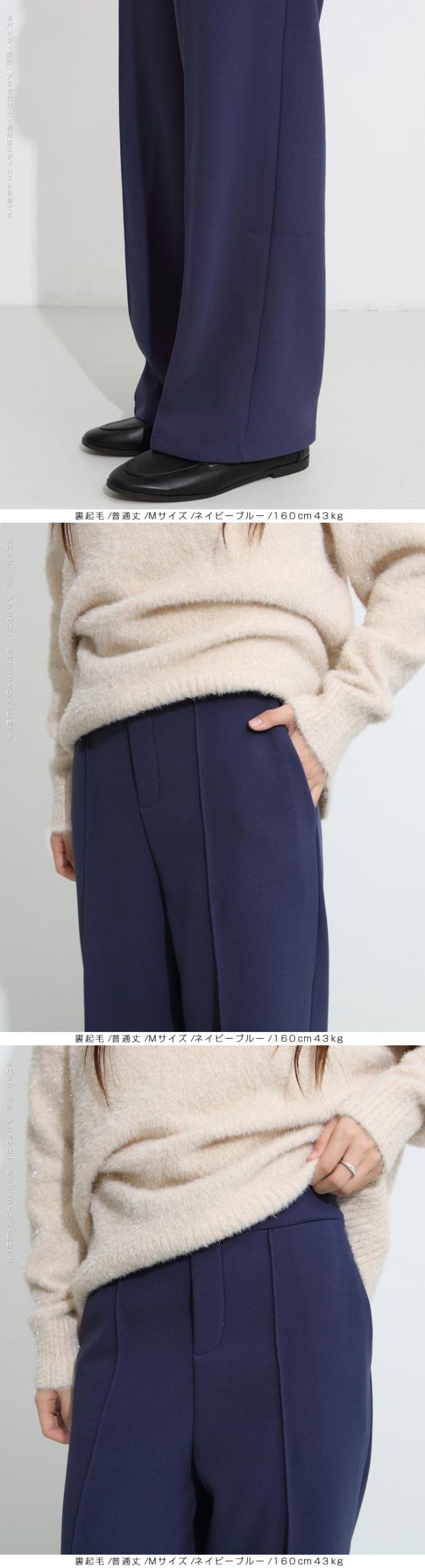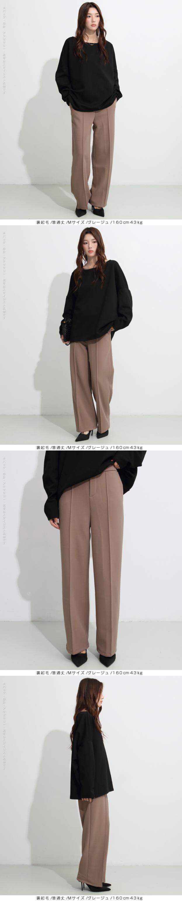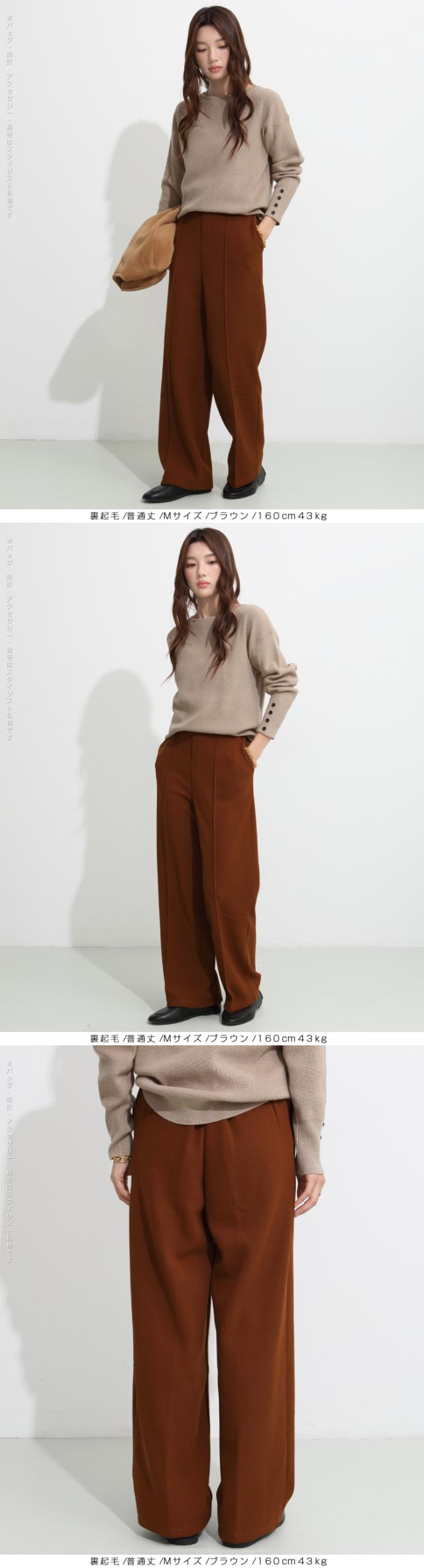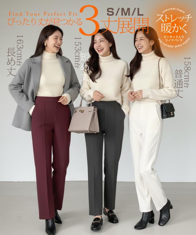 【 選べる2生地 ピンタック入りストレッチワイドパンツ 】 ストレッチ性があり動きやすく、 ピンタック入りできれいめに穿けるワイドパンツ。 あったかミンク風裏起毛と通年タイプの生地からお選び頂けます。 ウエストにはゴムが入っているため、一日中快適に履けます。 センタープレスとピンタックで美しいシルエットを保ち 短め丈、普通丈、長め丈の3種類から選べるので 身長に合わせたフィット感が得られる オフィスでもカジュアルでも使える万能パンツで、 豊富なカラーバリエーションも魅力。 " 《商品ポイント》 センタープレス入りで脚長&美脚効果抜群 ほどよい落ち感とストレートシルエットで体型カバーにも◎ ハリ感のある上質素材でシーンレスに活躍 シンプルデザインで合わせるトップスを選ばない万能パンツ カラーバリエーション豊富で着回し自在 《デザイン・シルエット》 ストンと落ちるストレートラインで美しいレッグラインを演出 センタープレスが縦のラインを強調し、脚を長くすっきり見せる ウエストはすっきりとしたフラット仕様でトップスインも映えるデザイン 程よいゆとりがありながらもだらしなく見えない絶妙シルエット 《コーディネート提案》 オフィスコーデ:シャツやジャケットを合わせてきちんと感あるスタイルに カジュアルコーデ:ゆるニットやTシャツと合わせて抜け感のあるリラックススタイルに トレンドコーデ:クロップド丈トップスと合わせてハイウエストを強調し、スタイルアップ シーズンレス活用:春夏はブラウスやTシャツに、秋冬はニットやコートに合わせて年中着回し可能 《サイズ・カラーバリエーション》 カラー:裏起毛タイプ…ブラック / アイボリー / グレージュ / ネイビーブルー / ブラウン / コーヒーブラウン / バーガンディ 通年タイプ…ブラック / グレージュ / ネイビーブルー / ダークブラウン サイズ:裏起毛タイプ…短め丈 / 普通丈 / 長め丈 / S / M / L 通年タイプ…短め丈 / 普通丈 / 長め丈 / M / L 《素材・機能性》 ・素材:裏起毛タイプ…ポリエステル97%、ポリウレタン3% 通年タイプ…ポリエステル95%、ポリウレタン5% ・透け感:裏起毛タイプ…なし 通年タイプ…淡いカラーは透ける場合がございます。 ヌーディーカラーのインナー着用をお願いいたします。 ・伸縮性…若干あり ・厚み:裏起毛タイプ…厚手 通年タイプ…普通(春〜秋に◎) |